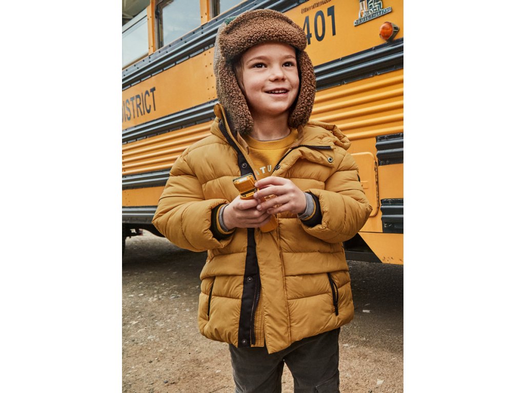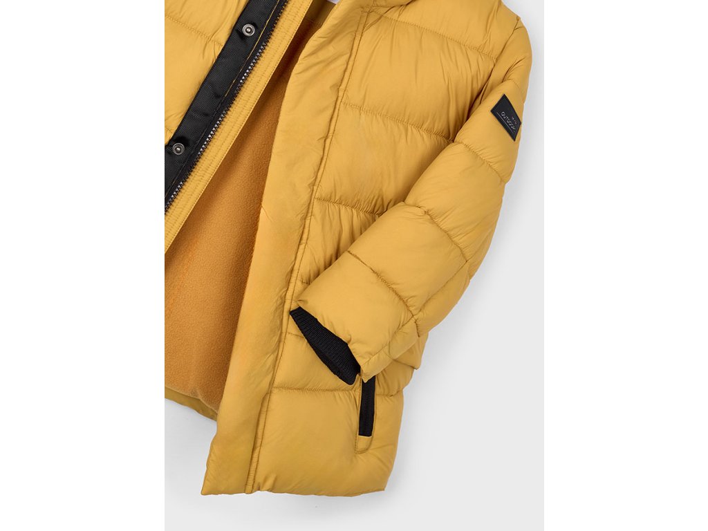 Stylová okrová chlapecká zimní bunda Mayoral Teplá prošívaná bunda s kapucí a zapínáním na zip i krycí légou ochrání před chladem i větrem. Má boční kapsy na zip, žebrované manžety proti profouknutí a moderní střih, který se hodí do školy i na zimní výlety. Pohodlná, kvalitní a ideální na každodenní nošení v chladných měsících.