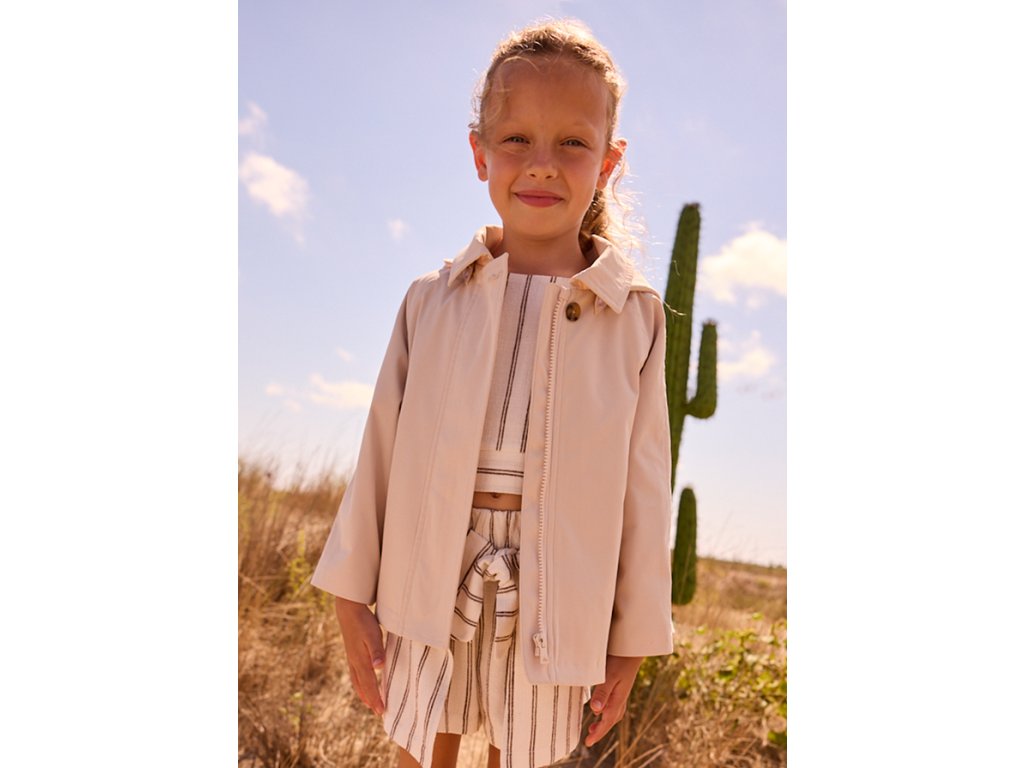 Stylová a praktická dívčí bunda Mayoral je ideální volbou pro jarní a podzimní dny. Elegantní béžové provedení se snadno kombinuje s jakýmkoli outfitem a sluší jak na běžné nošení, tak na slavnostnější příležitosti. Bunda má kapuci, zapínání na zip krytý légou a praktické kapsy. Díky lehkému, ale odolnému materiálu poskytuje pohodlí i ochranu před větrem a chladnějším počasím.