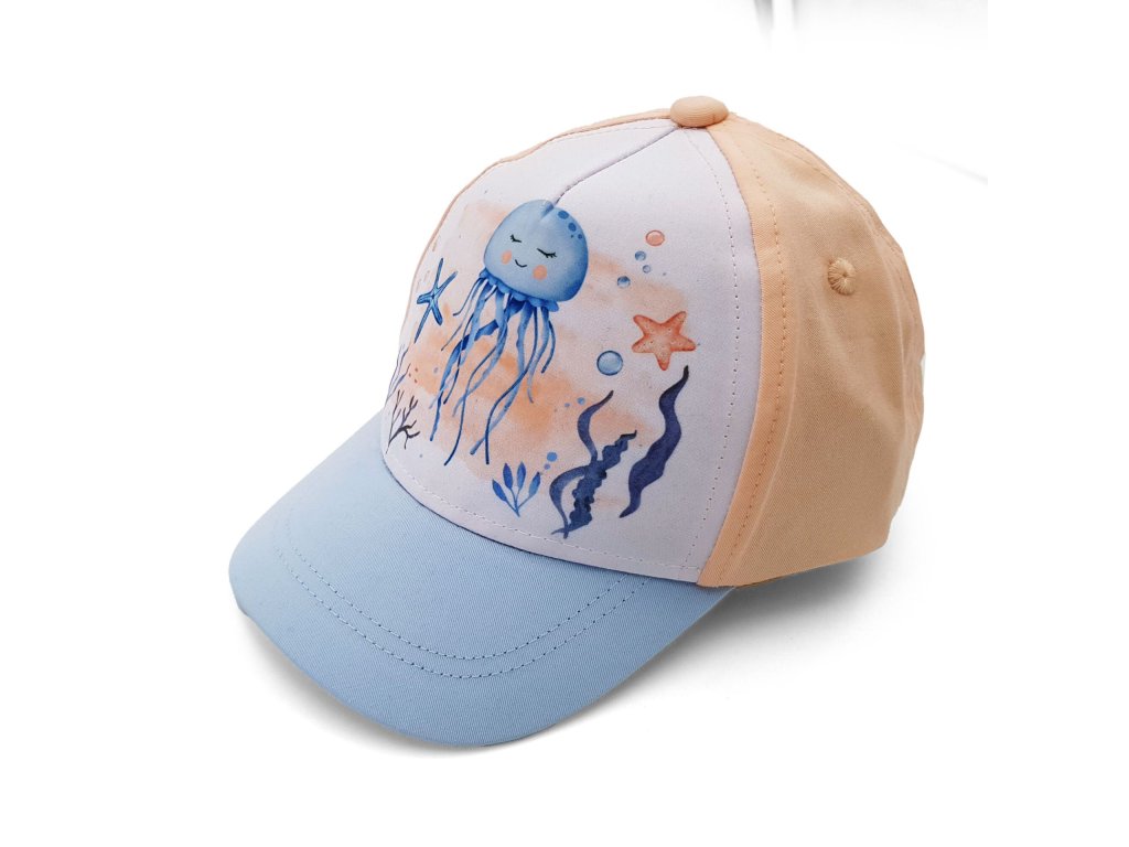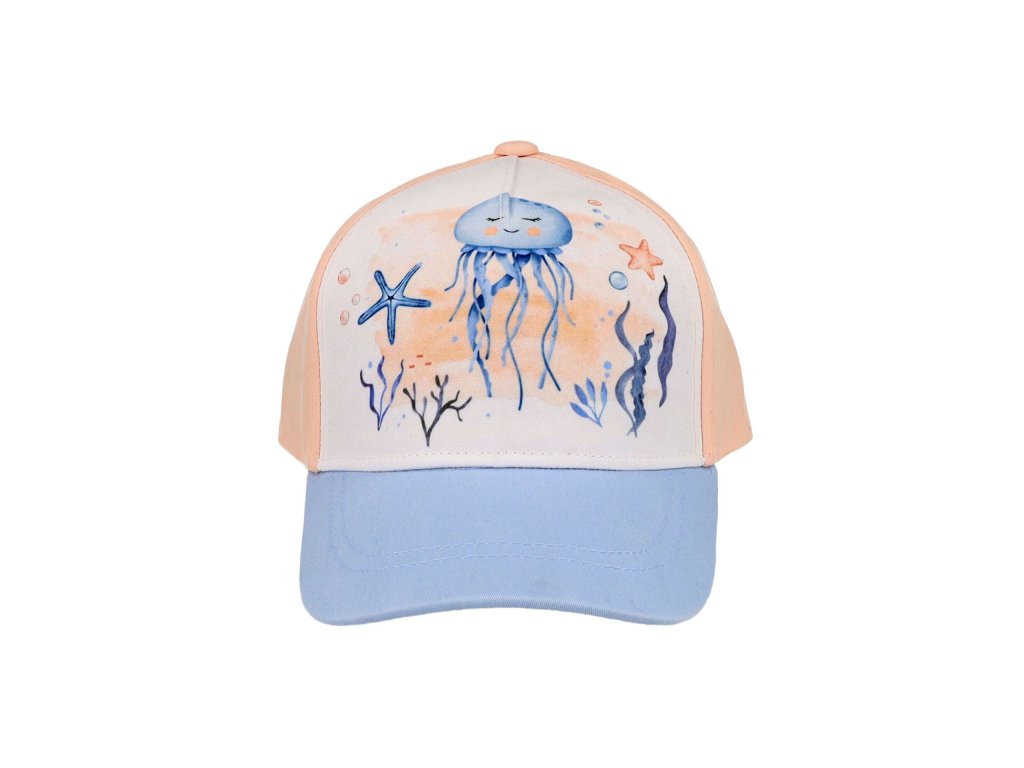 Roztomilá dívčí kšiltovka Maximo s motivem medúzy přináší hravý letní styl inspirovaný mořem. Přední panel zdobí něžná ilustrace medúzy, hvězdice a mořských rostlin, která dodává čepici veselý prázdninový vzhled.