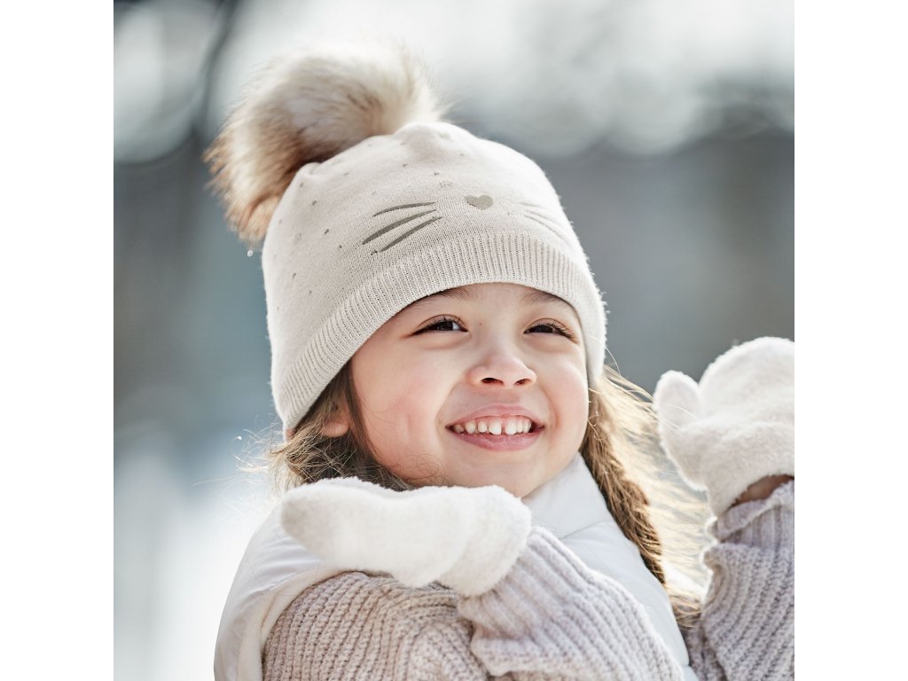 Roztomilá zimní čepice pro malé slečny s originálním motivem kočičky a módním knírkem z flocku. Vyrobena ze 100 % měkké bavlny, která zajišťuje maximální pohodlí a je šetrná k dětské pokožce. Stylová bambule z umělé kožešiny (fake fur) a bezešvý střih bez lemu vytvářejí moderní vzhled, který skvěle doplní jakýkoli zimní outfit. Čepice je navržena a vyrobena v Německu – garance kvality a pečlivého zpracování.