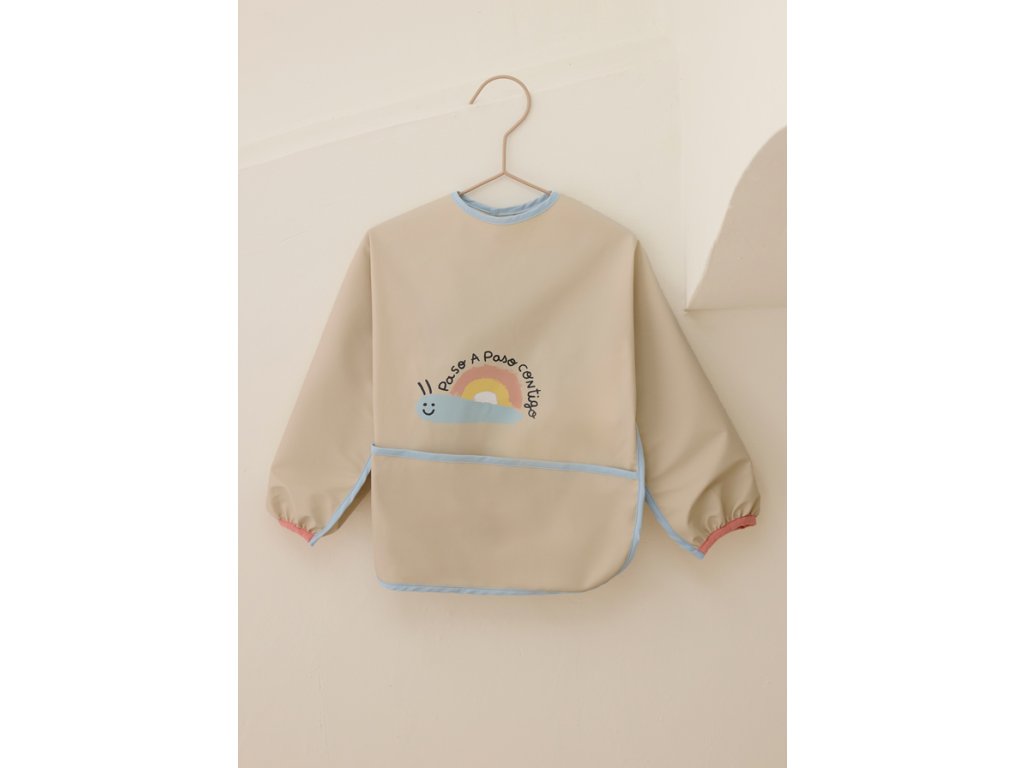 Bryndák je vyroben z lehkého, omyvatelného materiálu, který se snadno udržuje. Díky dlouhým rukávům a prodlouženému střihu poskytuje maximální ochranu. Zapínání za krkem na suchý zip umožňuje rychlé a pohodlné oblékání. Jemný motiv dodává bryndáčku hravý a dětský vzhled.
