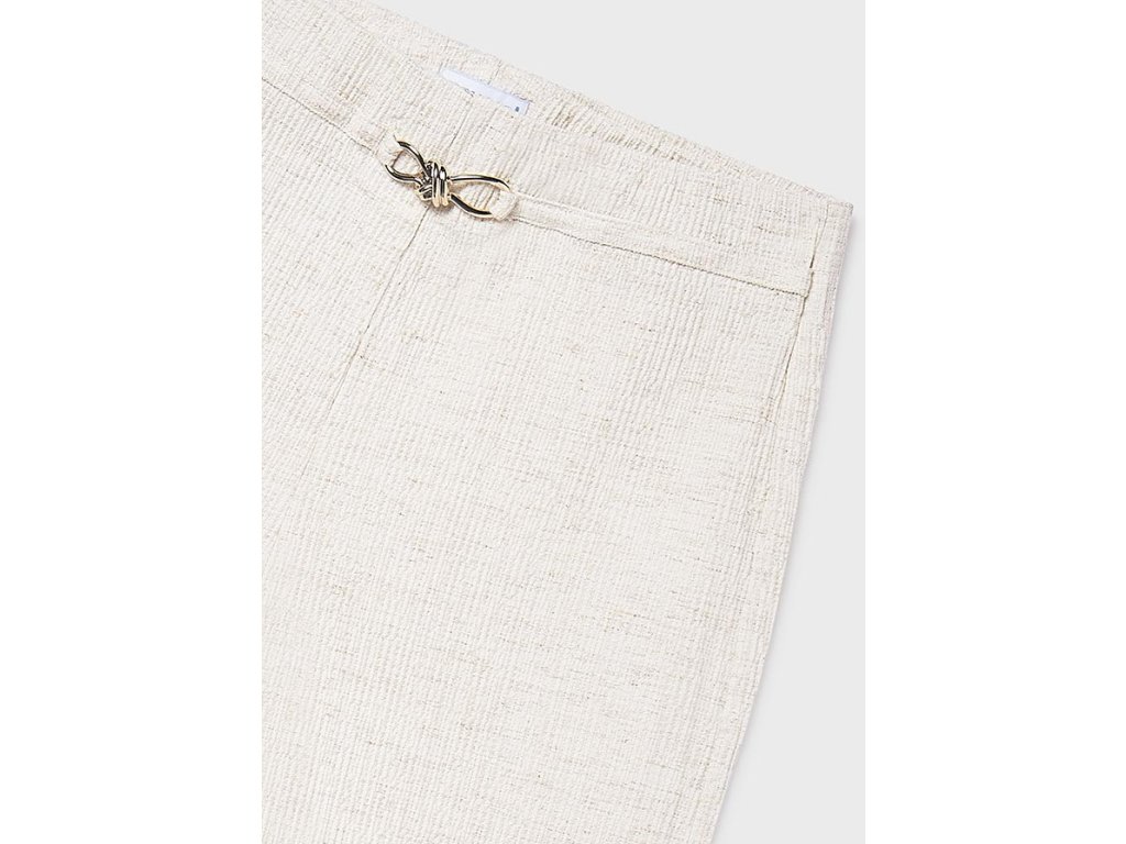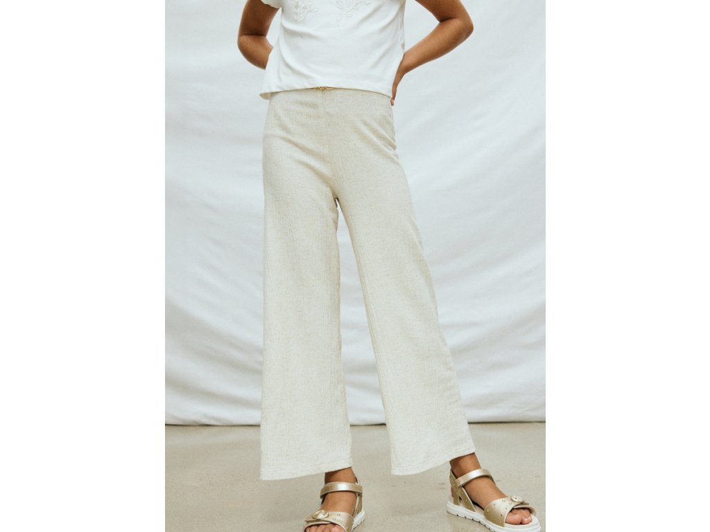 Elegantní dívčí široké kalhoty Mayoral v jemném béžovém odstínu jsou perfektní volbou pro slavnostní příležitosti i stylové letní outfity. Lehká strukturovaná tkanina s příměsí lnu působí velmi přirozeně a vzdušně, zatímco moderní široký střih dodává kalhotám nadčasový vzhled.