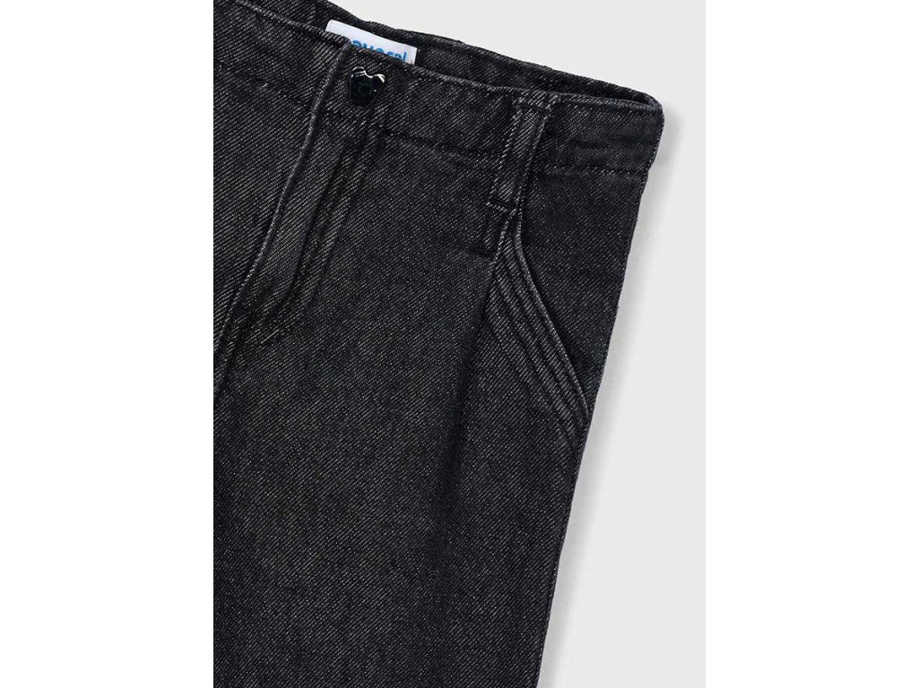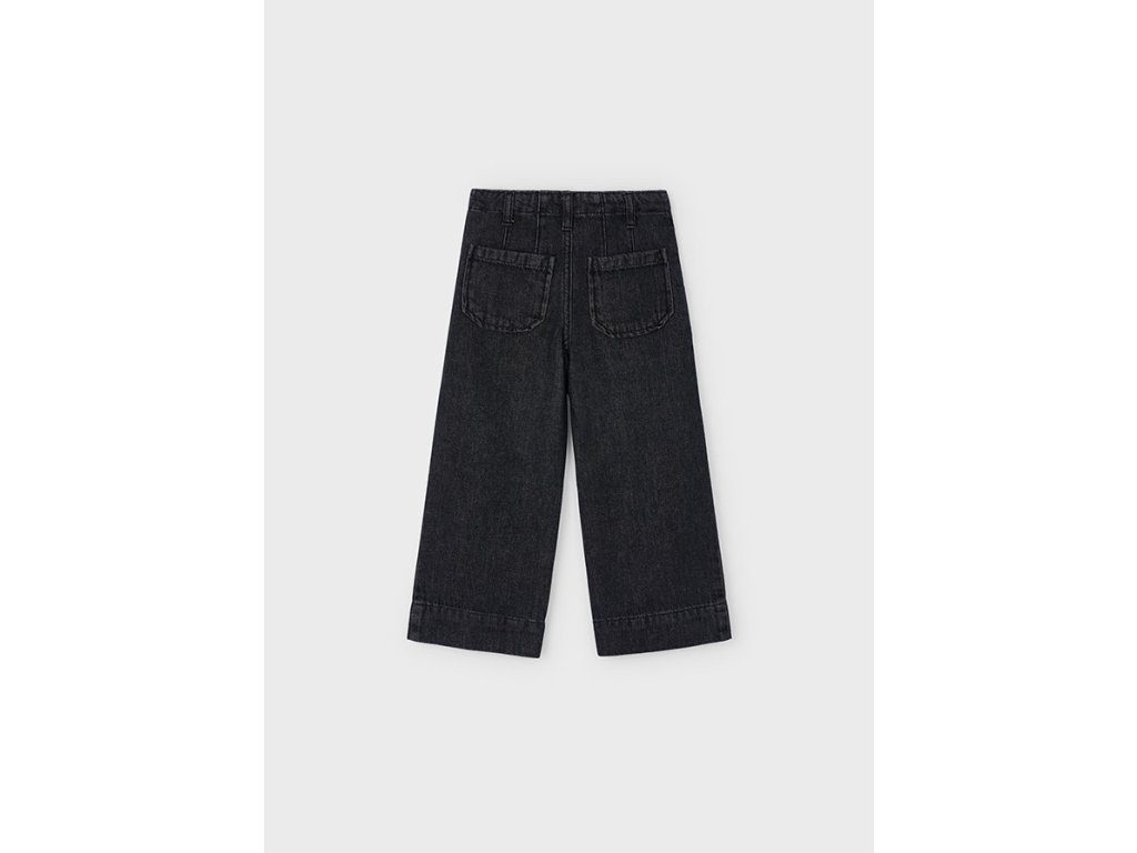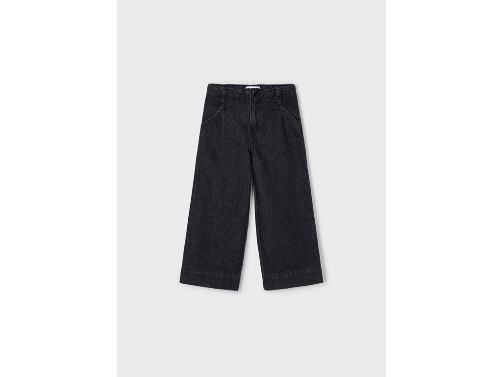 Stylové dívčí černé džínové kalhoty Mayoral se širokými nohavicemi a moderním střihem culotte. Vyrobené ze 100% kvalitní bavlny, která zajistí maximální pohodlí i pro každodenní nošení. Kalhoty mají klasické kapsy vpředu i vzadu, poutka na pásek a zapínání na knoflík a zip. Skvělý základ šatníku, který snadno zkombinujete s tričkem, mikinou i elegantnější halenkou.