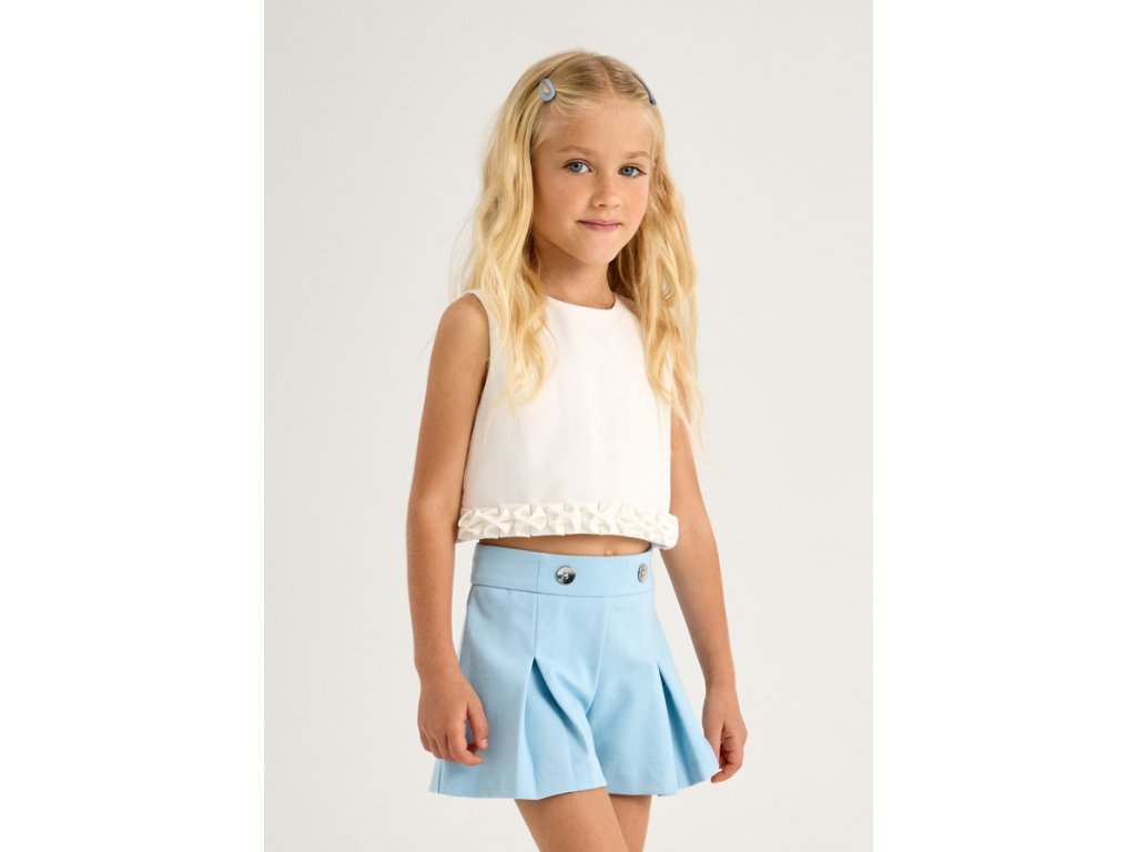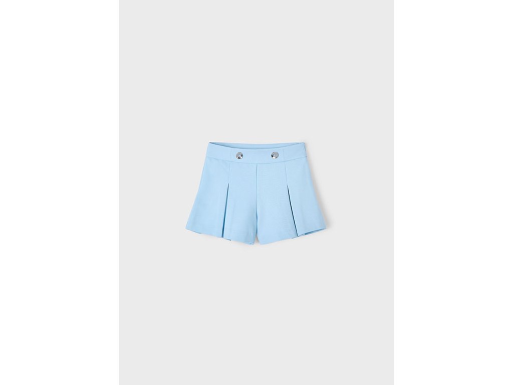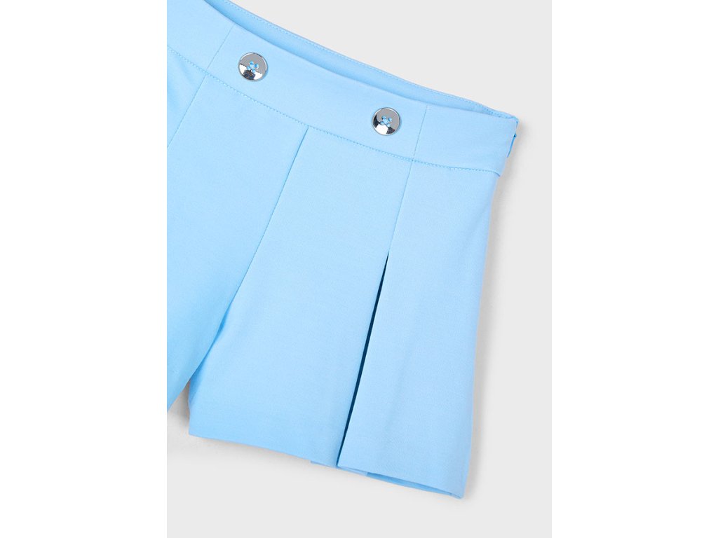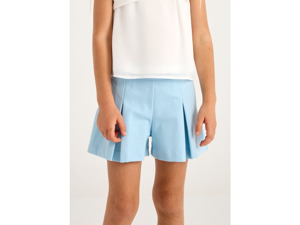 Elegantní a pohodlné dívčí kraťasy ve světle modré barvě s ozdobnými knoflíky v pase. Jemně rozšířený střih s decentními sklady dodává sofistikovaný vzhled, zatímco pružný materiál zajišťuje maximální pohodlí při nošení. Skvělá volba pro letní dny i slavnostnější příležitosti.