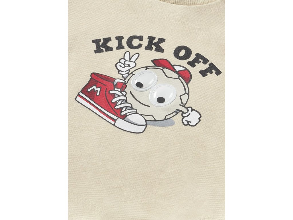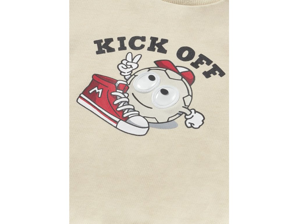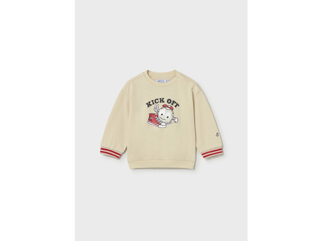 Stylová chlapecká mikina Mayoral v krémové barvě s hravým motivem Kick Off. Pohodlný střih a příjemný materiál zajistí komfort po celý den – ideální do školy, na hřiště i volný čas. Mikina zaujme originálním potiskem s plastickým detailem, který dodává modelu moderní a zábavný vzhled.