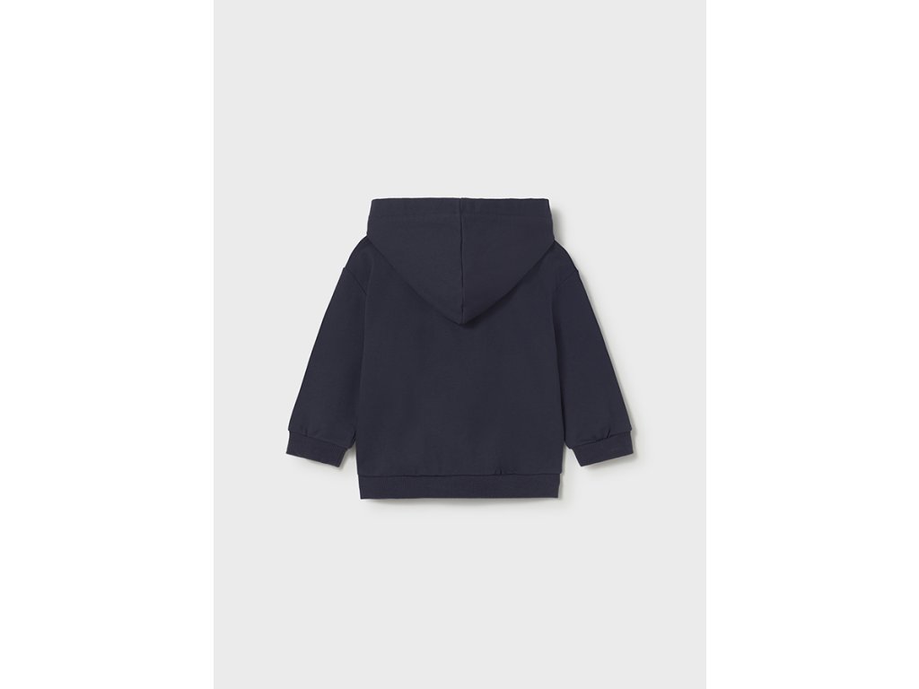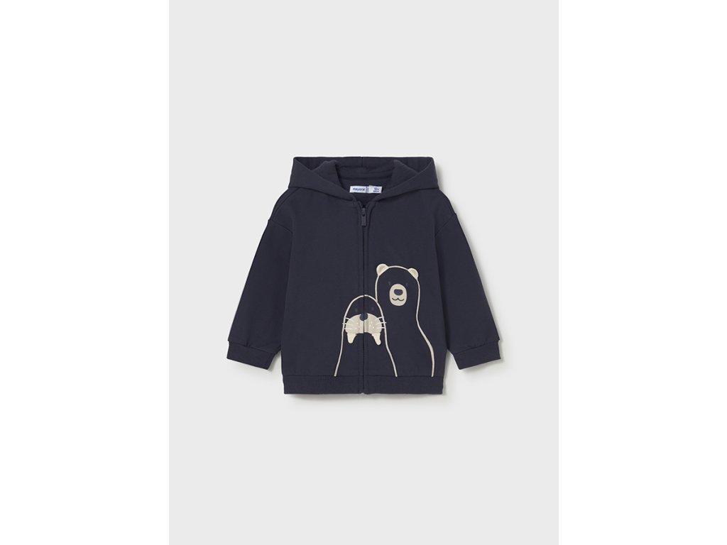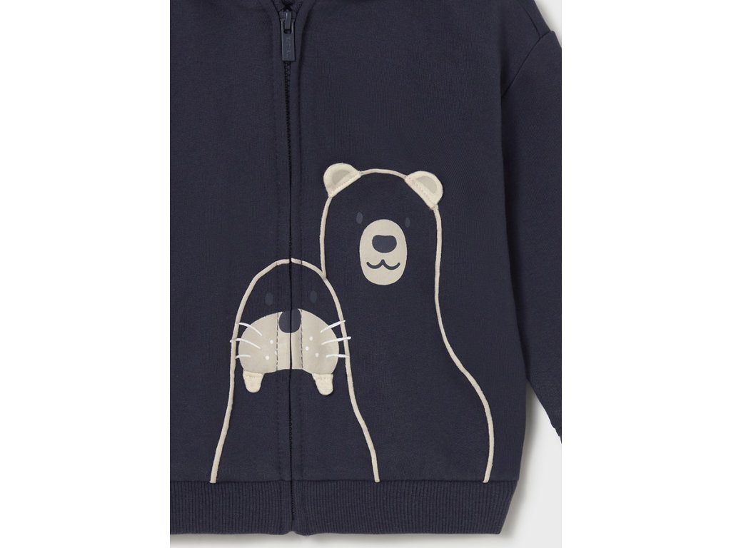 Stylová chlapecká mikina Mayoral v tmavě modré barvě s kapucí a zapínáním na zip. Přední stranu zdobí roztomilý potisk medvěda a tuleně s 3D detaily, které děti zaujmou. Mikina je pohodlná na každodenní nošení do školky i na hřiště.