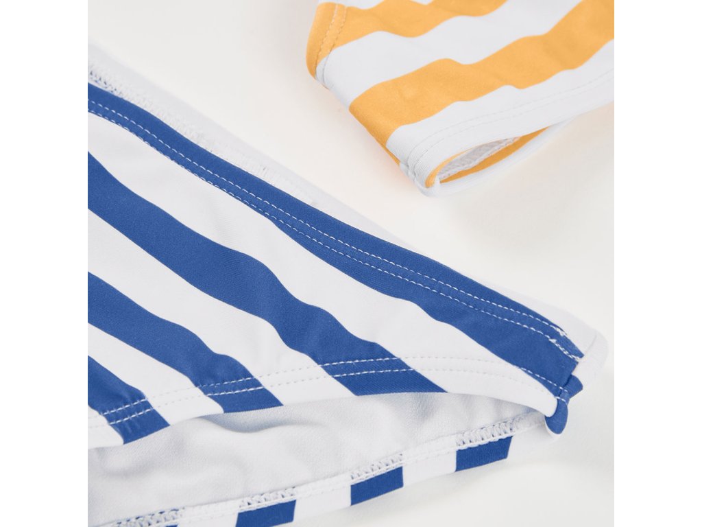 Spodní díl je zdoben klasickými modrobílými proužky, které dodávají plavkám letní námořnický styl. Elastický a rychleschnoucí materiál zajišťuje maximální pohodlí při koupání i celodenním nošení u vody.