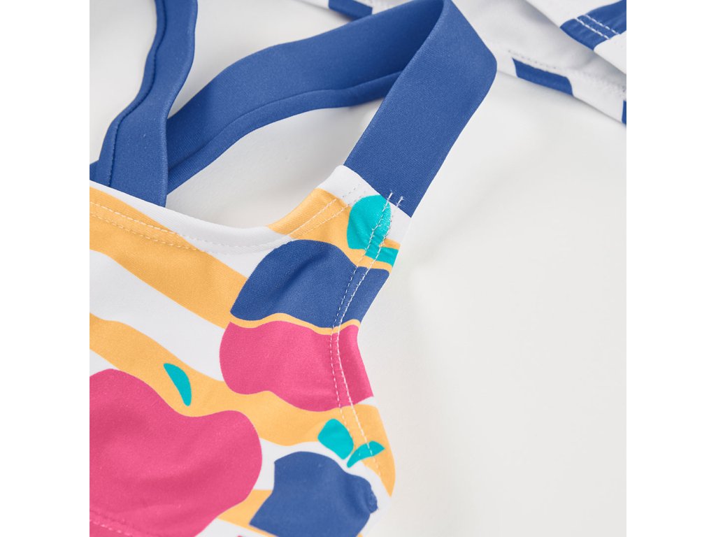 Veselé dívčí dvoudílné plavky Boboli zaujmou hravým designem s barevnými proužky a motivem jablíček. Horní díl má pohodlná široká ramínka křížená na zádech, díky kterým plavky dobře drží a neomezují dítě při pohybu ve vodě ani při hrách na pláži.