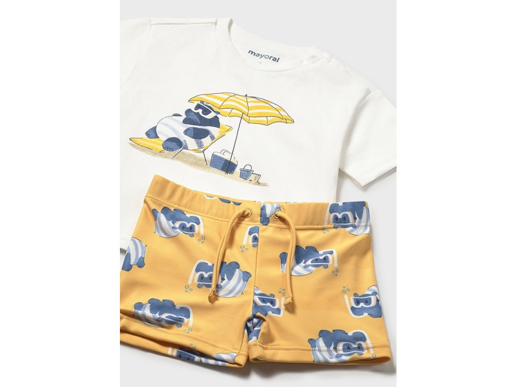 Roztomilý chlapecký letní set Mayoral pro nejmenší je ideální na prázdniny, k moři i k bazénu. Set tvoří pohodlné bavlněné tričko s veselým potiskem pandy odpočívající pod slunečníkem a stylové plavkové kraťasy s hravým motivem.