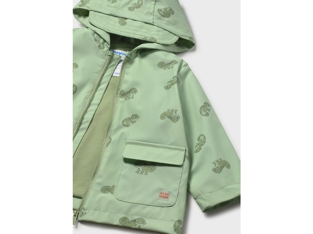 Stylová a praktická dětská pláštěnka Mayoral je ideální volbou do deštivého počasí. Nepromokavý materiál spolehlivě ochrání dítě před vlhkem, zatímco měkká podšívka zajistí pohodlí při nošení. Roztomilý potisk chameleonů dodává bundě hravý vzhled, který si děti zamilují.