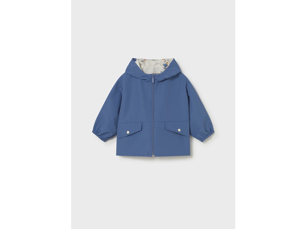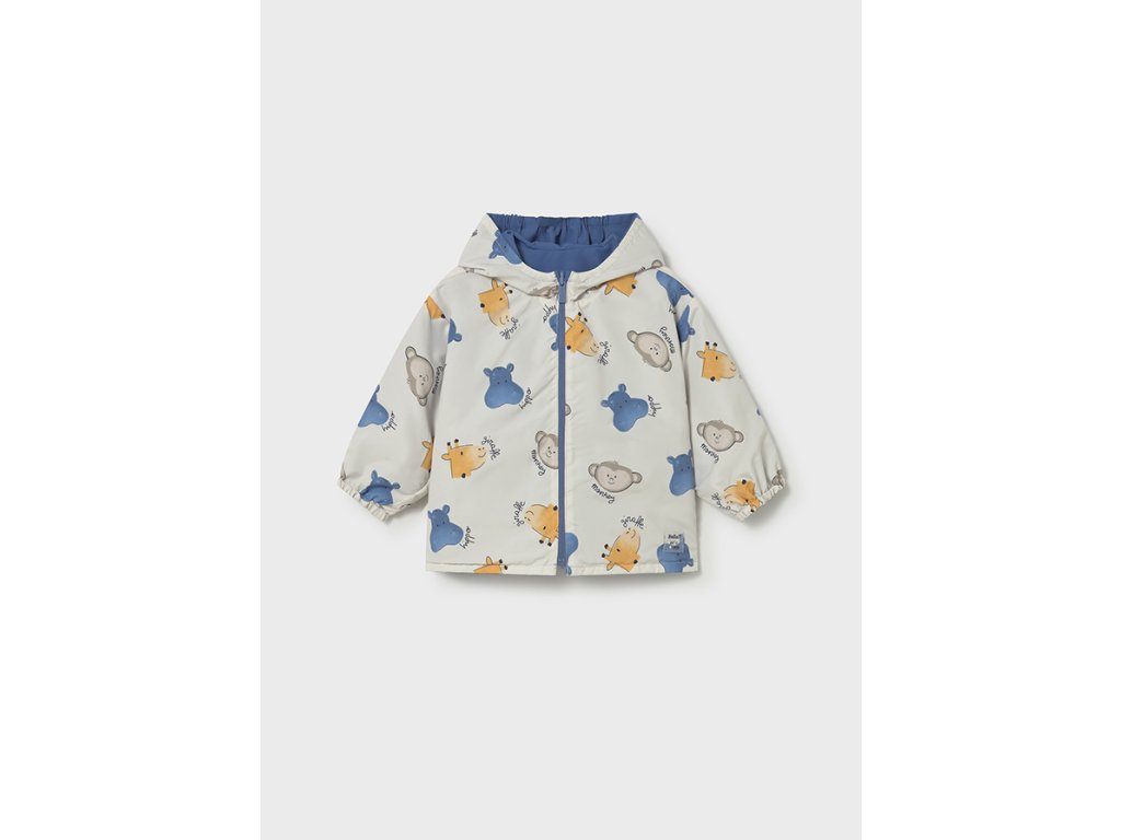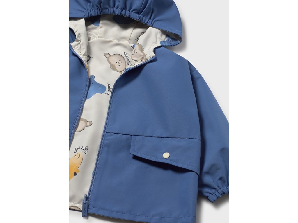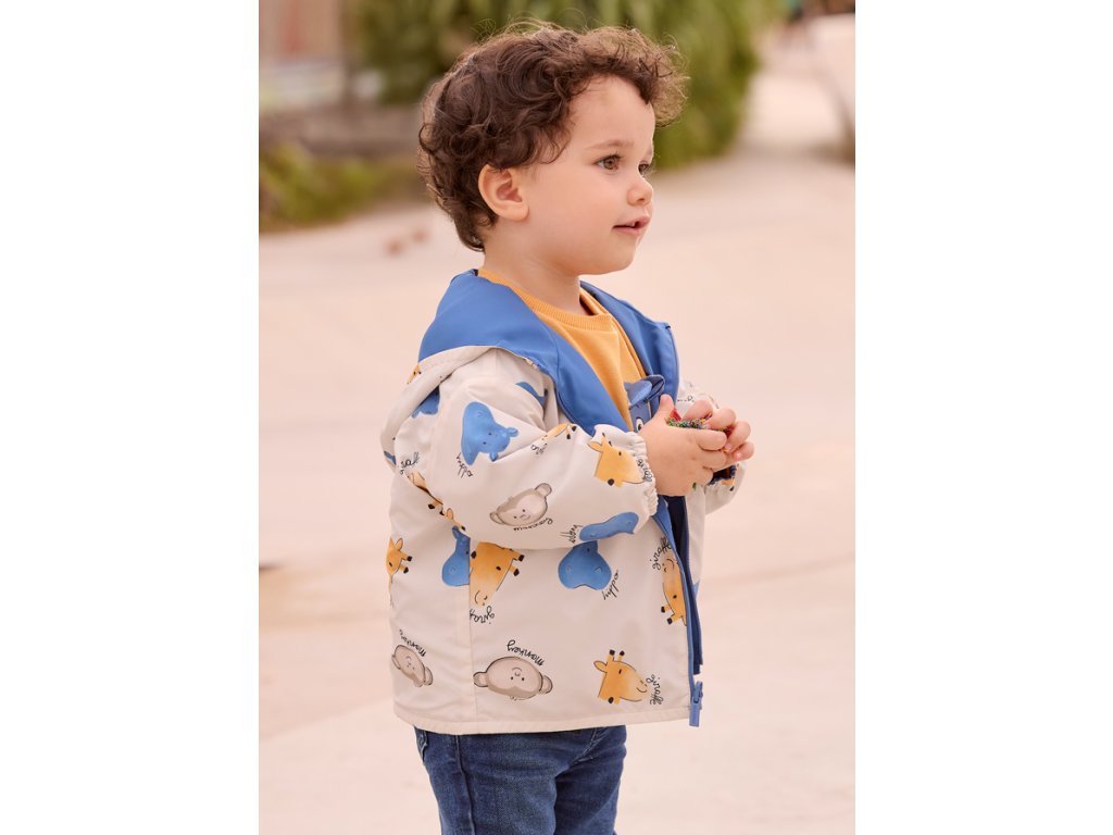 Roztomilá oboustranná dětská bunda Mayoral je ideální volbou pro jarní a podzimní dny. Z jedné strany zaujme veselým potiskem zvířátek, z druhé strany elegantním jednobarevným modrým provedením. Díky oboustrannému designu nabízí dva různé styly v jednom kousku.