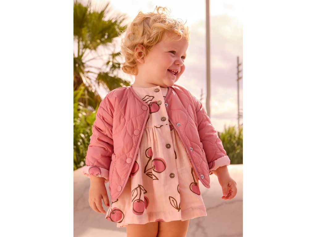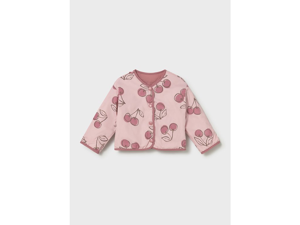 Stylová a praktická oboustranná prošívaná bunda Mayoral je ideální volbou pro malé holčičky do proměnlivého jarního či podzimního počasí. Z jedné strany jemná starorůžová s elegantním prošíváním, z druhé hravý potisk třešní, který dodá outfitu veselý nádech.