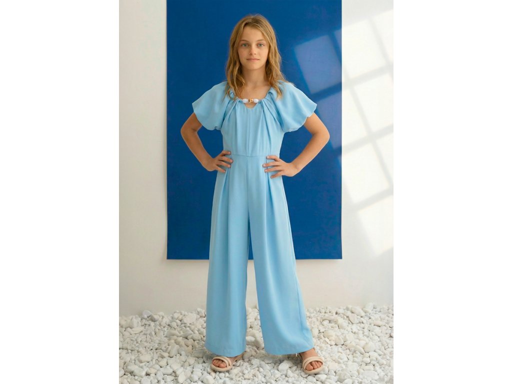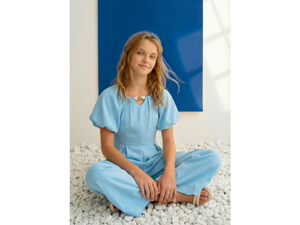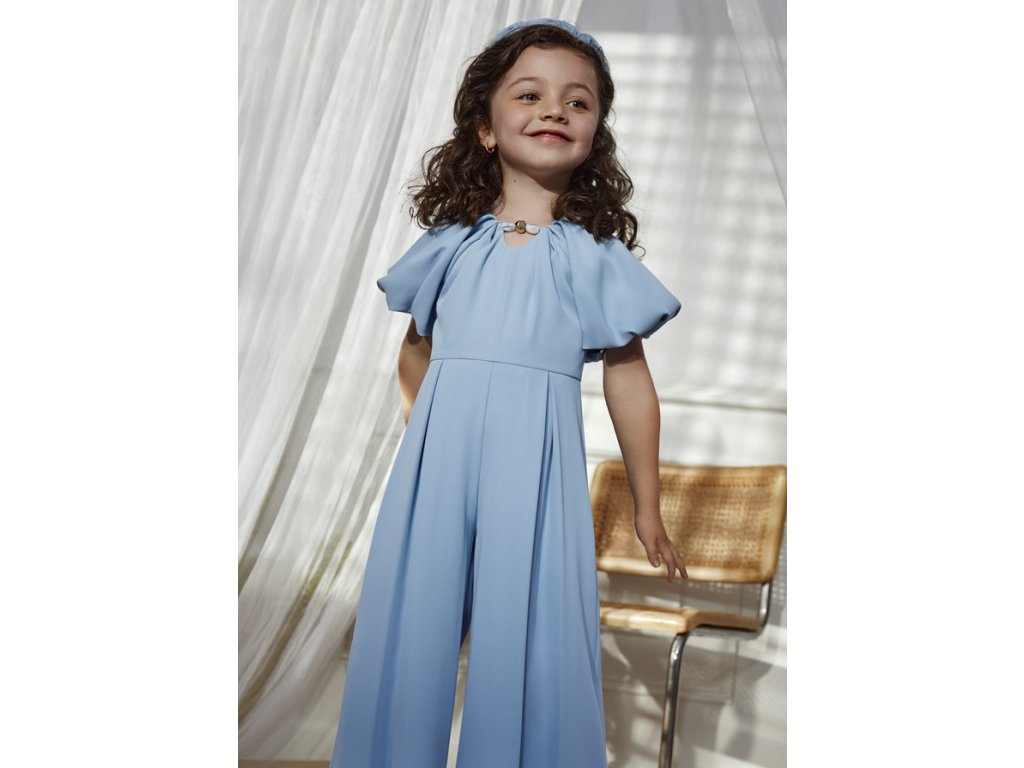 Elegantní dívčí overal Abel & Lula v nádherné světle modré barvě je dokonalou volbou pro slavnostní příležitosti. Jemný, splývavý materiál, sofistikovaný střih a výrazné nabírané rukávy vytváří mimořádně něžný a stylový vzhled.