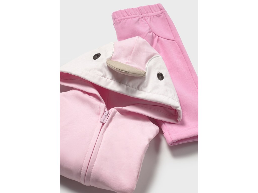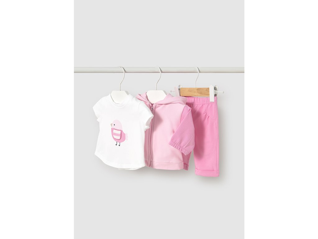 Roztomilá a pohodlná 3dílná souprava od Mayoral, ve které se vaše malá princezna bude cítit jako v oblacích! Souprava obsahuje tričko s veselým růžovým ptáčkem, měkkou mikinku s kapucí a roztomilými oušky a pružné legínky ve stejném pastelovém odstínu.