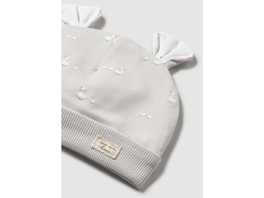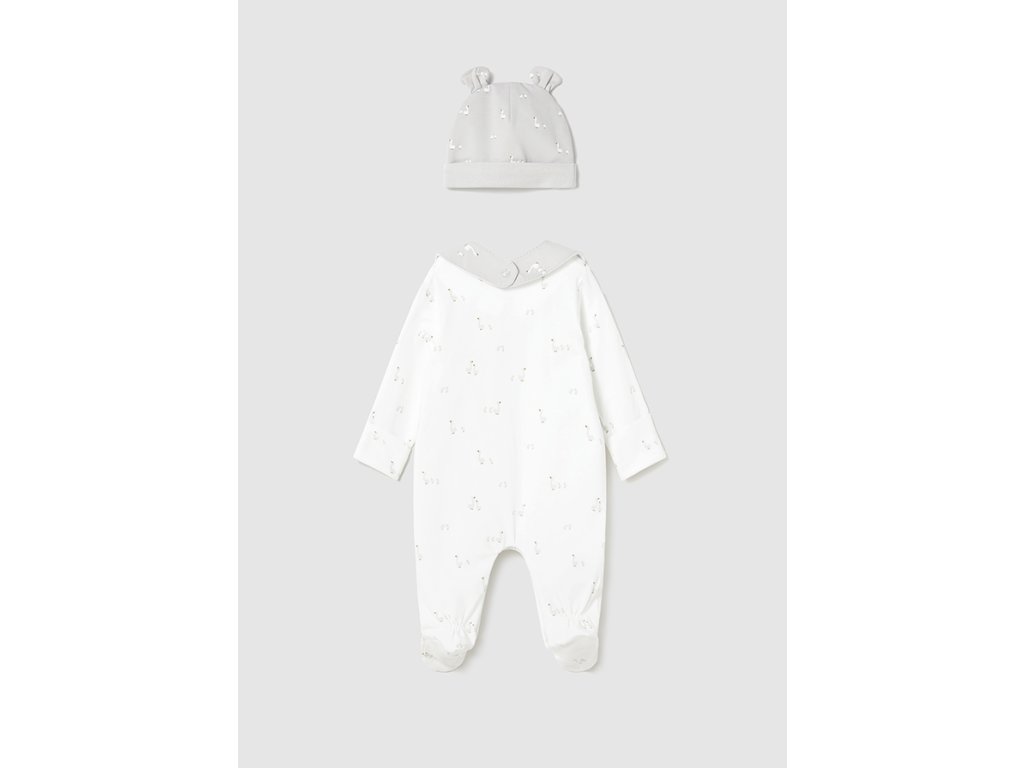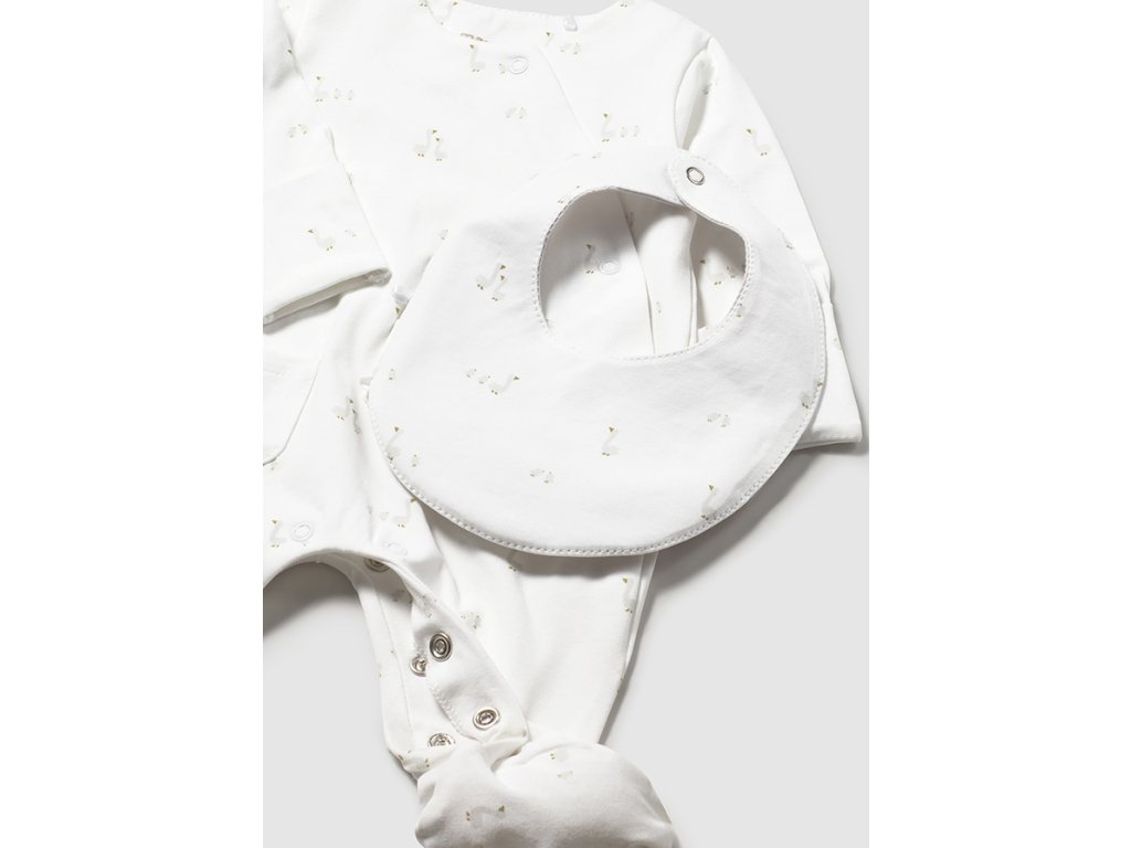 Roztomilý newborn set Mayoral v jemných neutrálních tónech je ideální pro první dny miminka. Set obsahuje pohodlné bavlněné pyžamko, měkkou čepičku a praktický bryndáček, vše sladěné do něžného designu s motivem husiček.