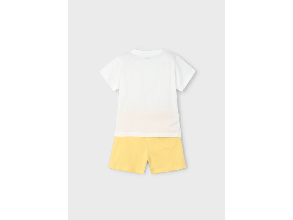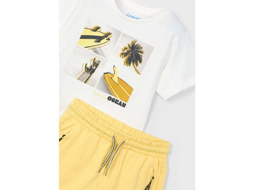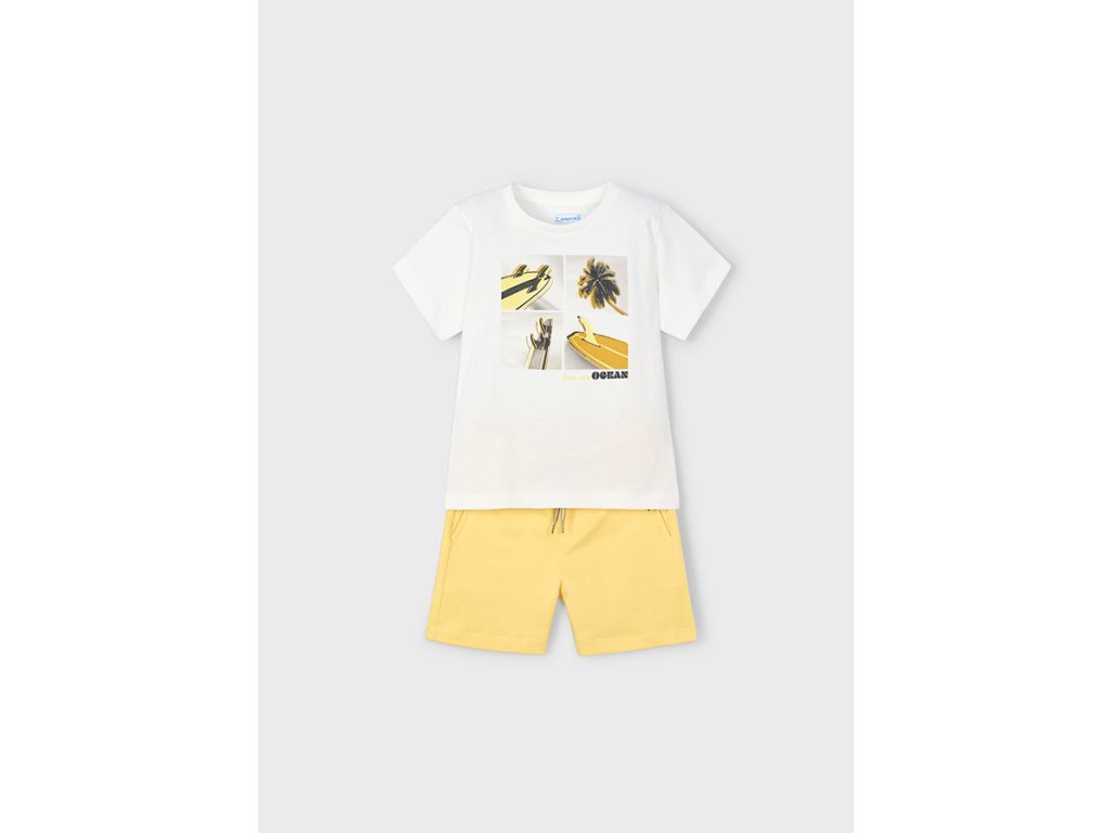 Stylová a pohodlná letní souprava pro chlapce od značky Mayoral. Bílý bavlněný krátký rukáv s trendy potiskem surfů a palem evokuje letní pohodu u oceánu. K tomu ladící žluté kraťasy s elastickým pasem a šňůrkami na utažení zajistí maximální komfort. Perfektní na letní dobrodružství i volný čas.