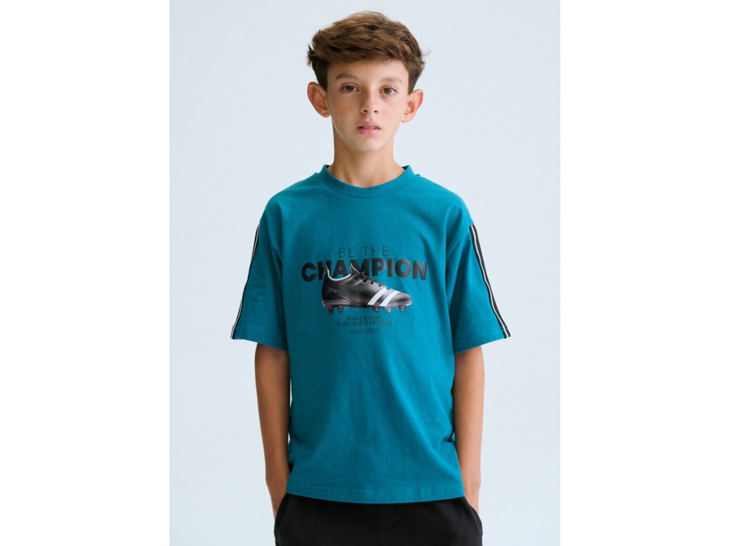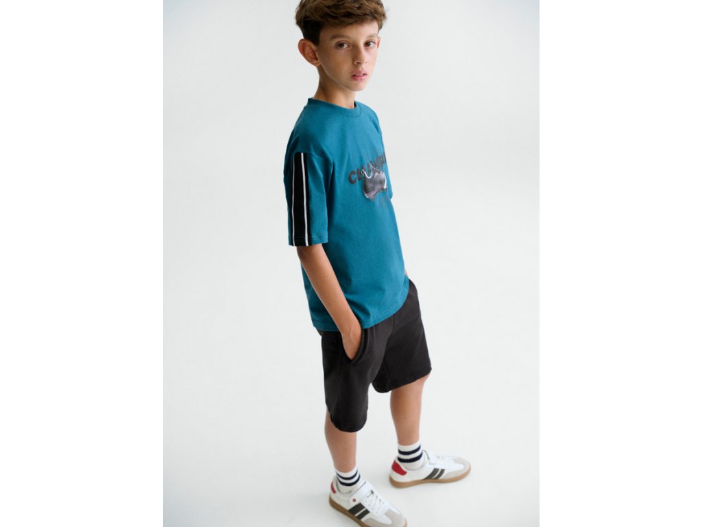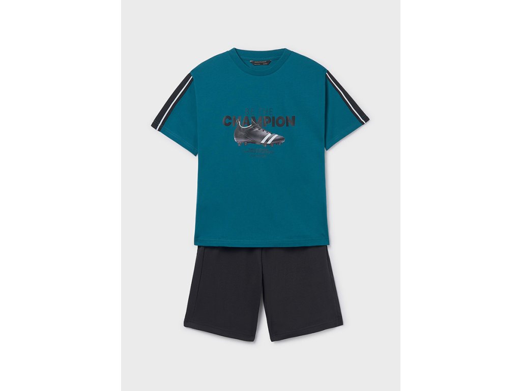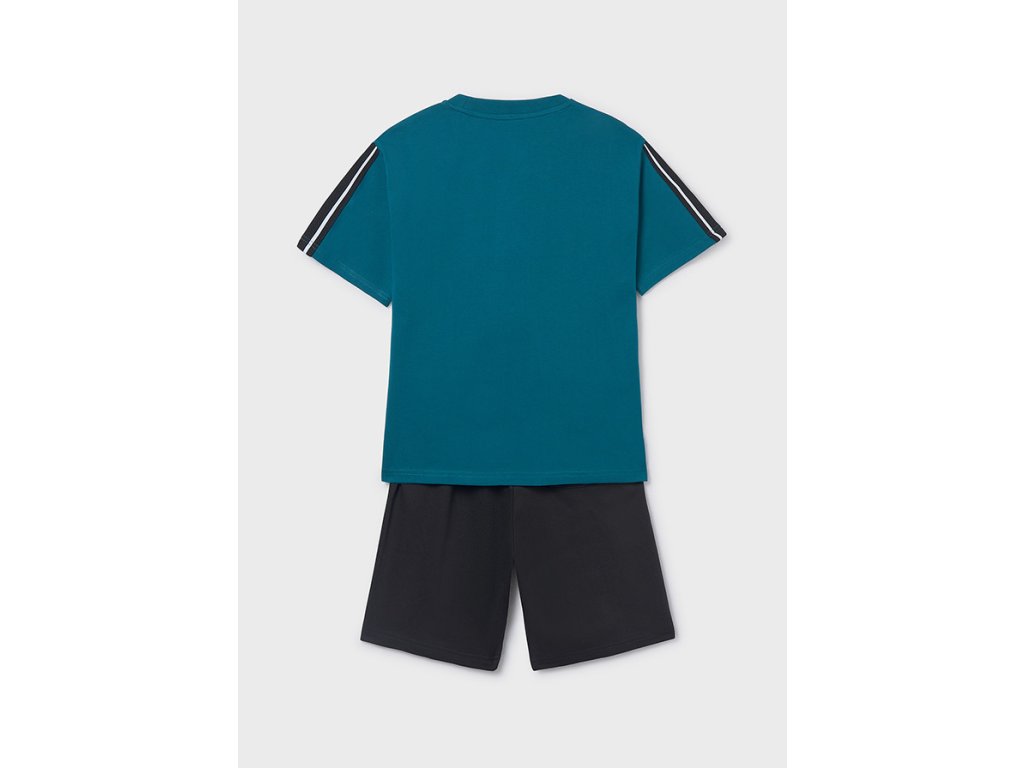 Tričko je vyrobené ze 100% bavlny, je příjemné na nošení, prodyšné a ideální do teplých dnů. Sportovní potisk a kontrastní pruhy na rukávech dodávají setu moderní a trendy vzhled. Bermudy jsou z pružné směsi bavlny, polyesteru a elastanu, díky čemuž skvěle sedí, neomezují v pohybu a jsou vhodné na každodenní nošení, sport i volný čas.