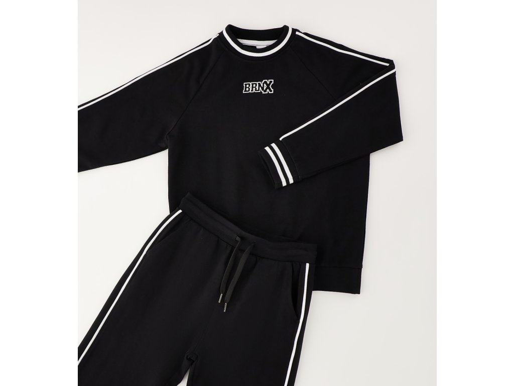 Stylová chlapecká tepláková souprava iDO v černé barvě je ideální volbou pro kluky, kteří mají rádi pohodlí i moderní sportovní styl. Set tvoří pohodlná mikina a tepláky s kontrastními bílými pruhy na rukávech a nohavicích, které dodávají outfitu dynamický streetwear vzhled.