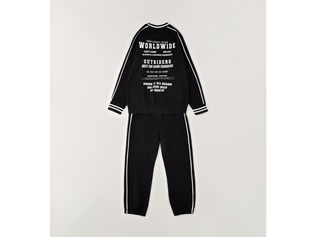 Mikina má klasický kulatý výstřih, pružné lemy a moderní potisk na zádech s motivem WORLDWIDE, který dodává soupravě originální charakter. Tepláky mají elastický pas se stahovací šňůrkou, praktické kapsy a pohodlný střih, který umožňuje volnost pohybu při každodenních aktivitách.
