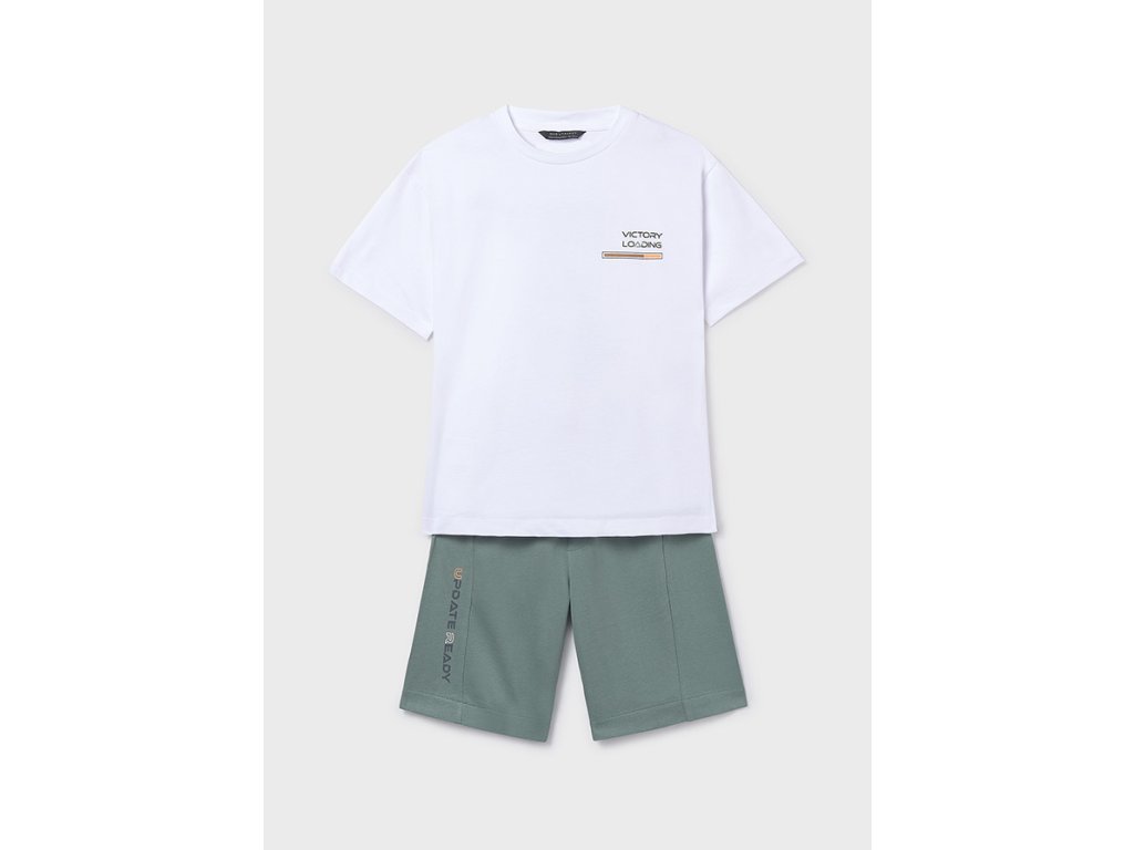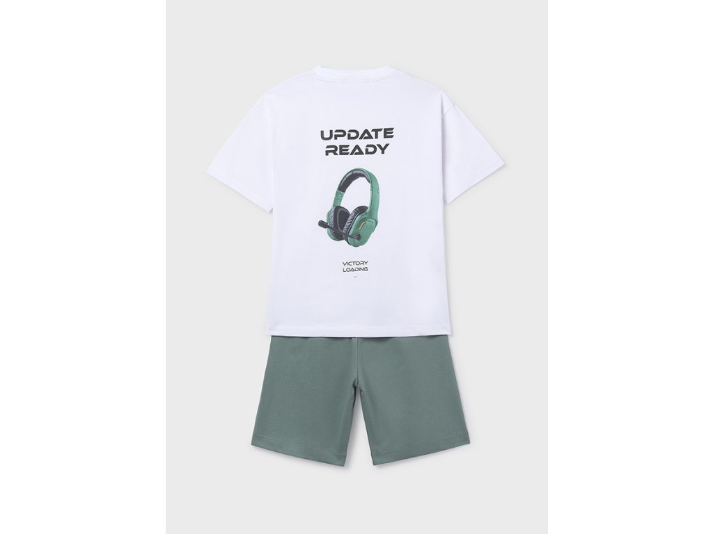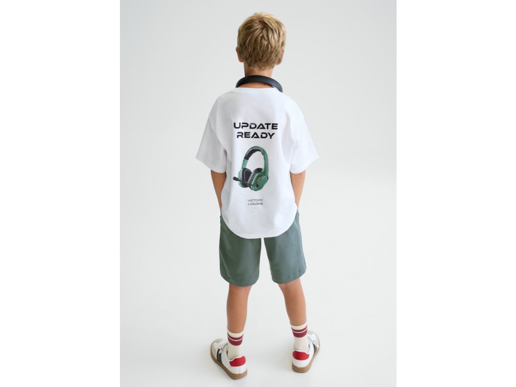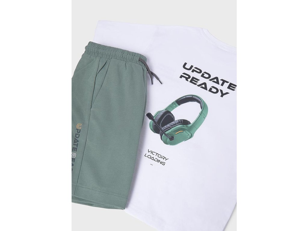 Tričko zaujme výrazným potiskem sluchátek a nápisem “UPDATE READY” na zadní straně, zatímco na přední straně je menší stylový detail s textem “Victory Loading”. Kraťasy v moderním zeleném odstínu mají pohodlný elastický pas se šňůrkou a praktické kapsy, takže jsou ideální na každodenní nošení, do školy, na výlety i volný čas.