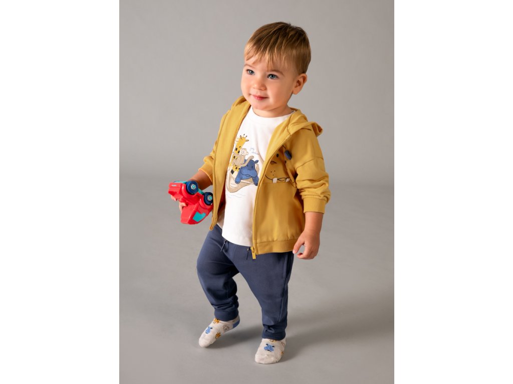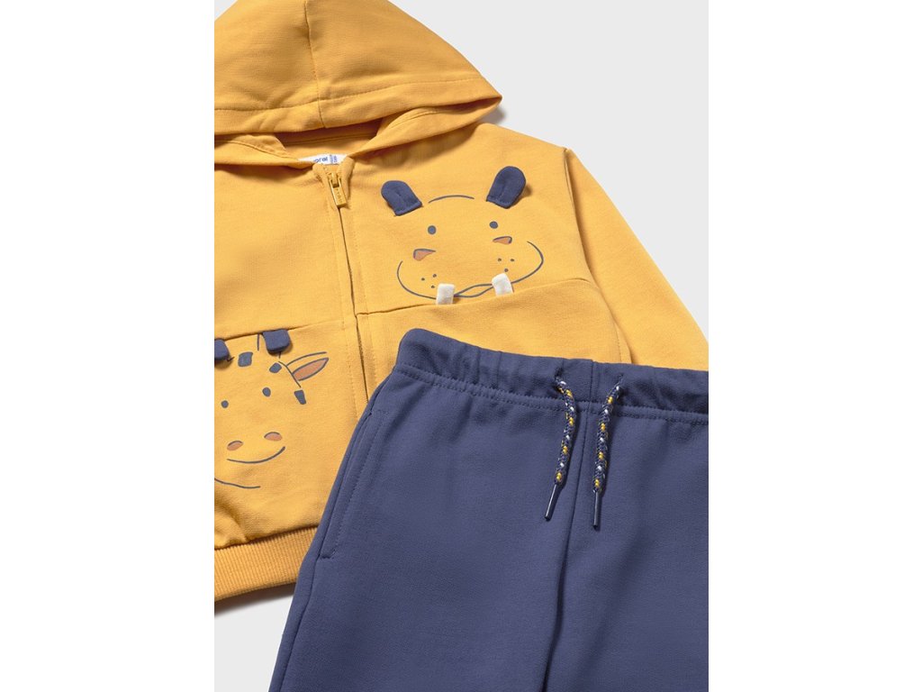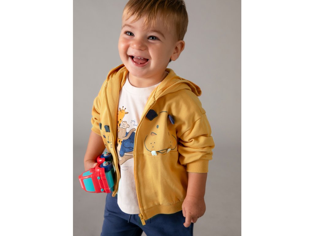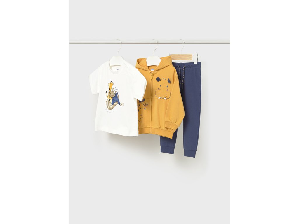 Roztomilá a pohodlná chlapecká tepláková souprava Mayoral je ideální volbou pro každodenní nošení, hraní i výlety. Set se skládá z mikiny na zip s kapucí, bavlněného trička s veselým zvířecím motivem a pohodlných tepláků s elastickým pasem.