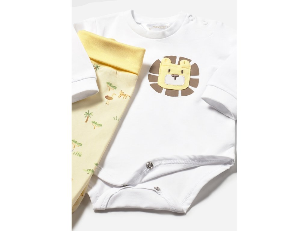 Body je zdobené milým motivem lvíčka, kalhoty i čepička mají hravý potisk se zvířátky. Praktické zapínání na druky usnadňuje oblékání i přebalování. Díky vysokému podílu bavlny je set jemný k citlivé dětské pokožce.