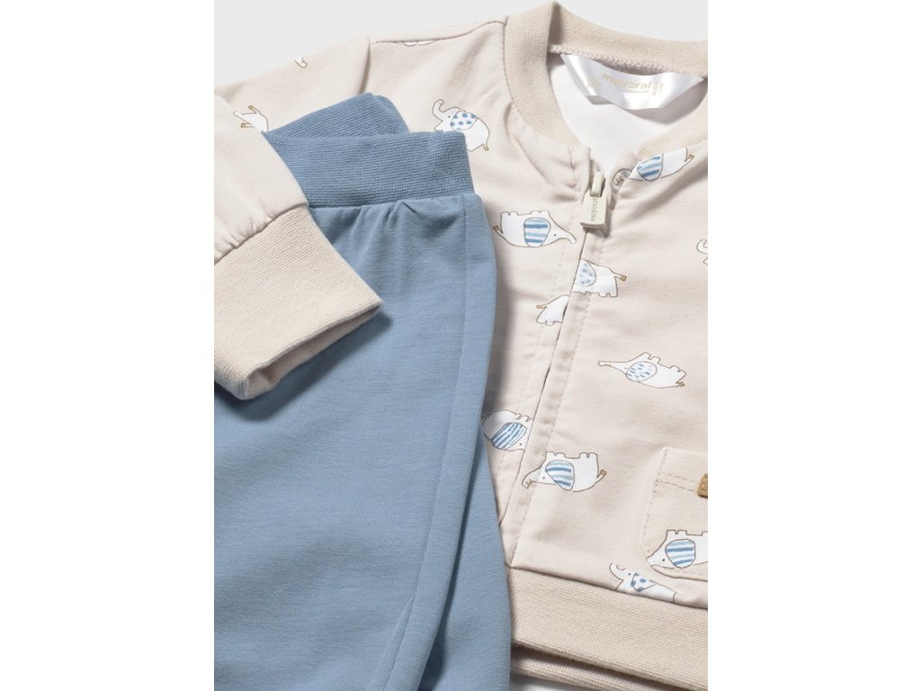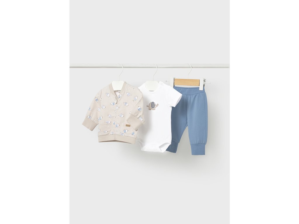 Roztomilý kojenecký set Mayoral v jemné béžovo-modré kombinaci je ideální volbou pro každodenní pohodlí i stylové chvíle. Komplet tvoří lehká bundička s praktickým zapínáním na zip, pohodlné body s krátkým rukávem a měkké kalhoty. Hravý motiv slonů dodává setu něžný, dětský vzhled.