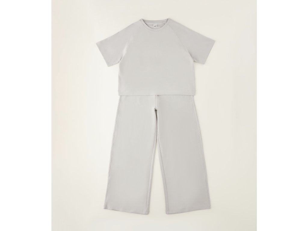 Moderní dívčí set I DO v jemné šedivé barvě je ideální volbou pro stylové a pohodlné každodenní nošení. Minimalistický komplet tvoří krátké tričko s krátkým rukávem a pohodlné široké kalhoty, které vytvářejí trendy a zároveň velmi komfortní outfit.