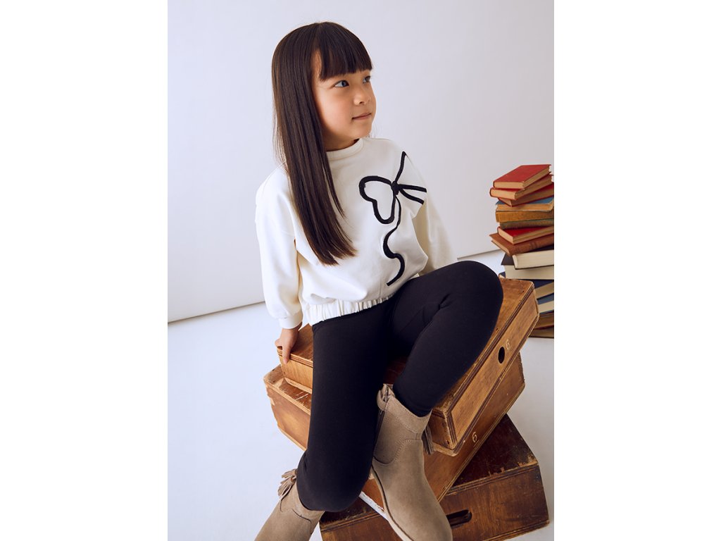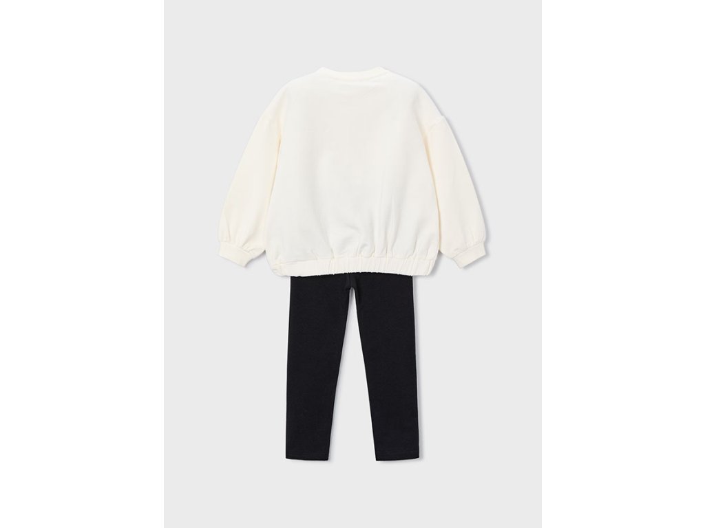 Stylová dívčí souprava Mayoral se skládá z pohodlné mikiny a legín. Mikina v bílé barvě zaujme výrazným designem s černou mašlí z flitrů, který dodává outfitu hravý i elegantní nádech. Černé legíny s elastickým pasem perfektně padnou a zajišťují volnost pohybu při každodenním nošení.