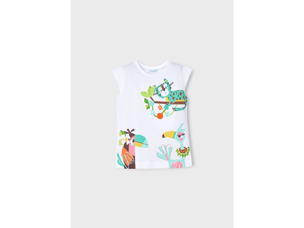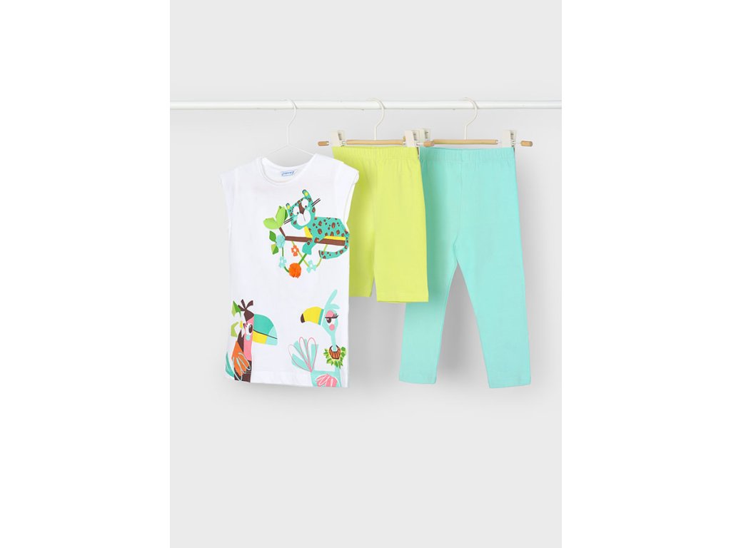 Rozveselte letní dny s tímto veselým dívčím setem od značky Mayoral. Set se skládá z bílého trička bez rukávů s barevným potiskem tropických zvířat, krátkých neonově žlutých legín a světle tyrkysových dlouhých legín. Tento pohodlný a stylový komplet je ideální pro aktivní dny plné her i odpočinku.