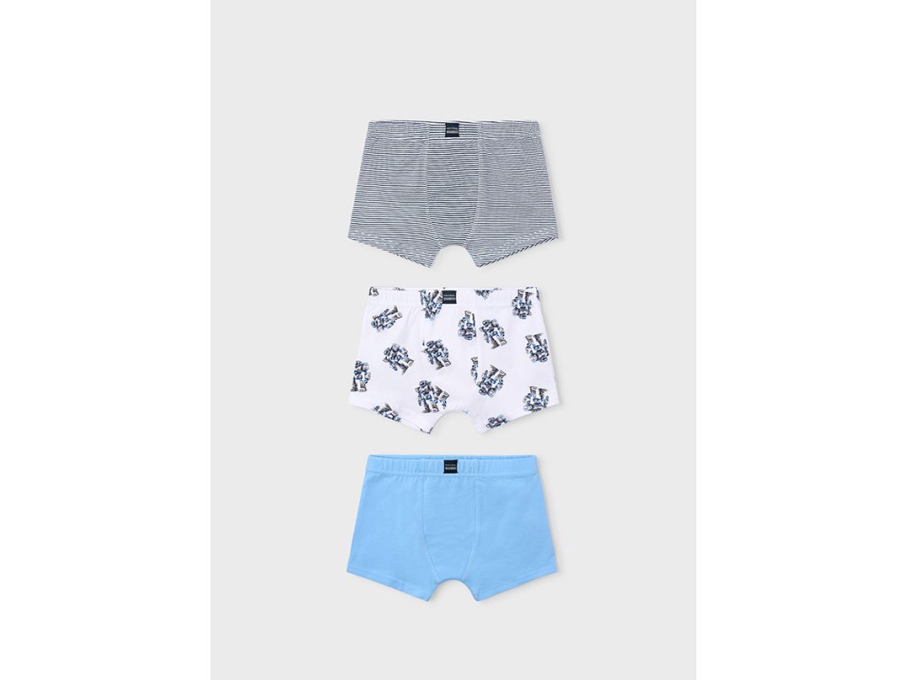 Praktický set tří chlapeckých boxerek Mayoral v modro-bílé kombinaci je ideální volbou pro každodenní pohodlí. Balení obsahuje jeden pruhovaný model, jeden s potiskem robotů a jeden jednobarevný světle modrý kousek – perfektní mix hravosti a klasiky.