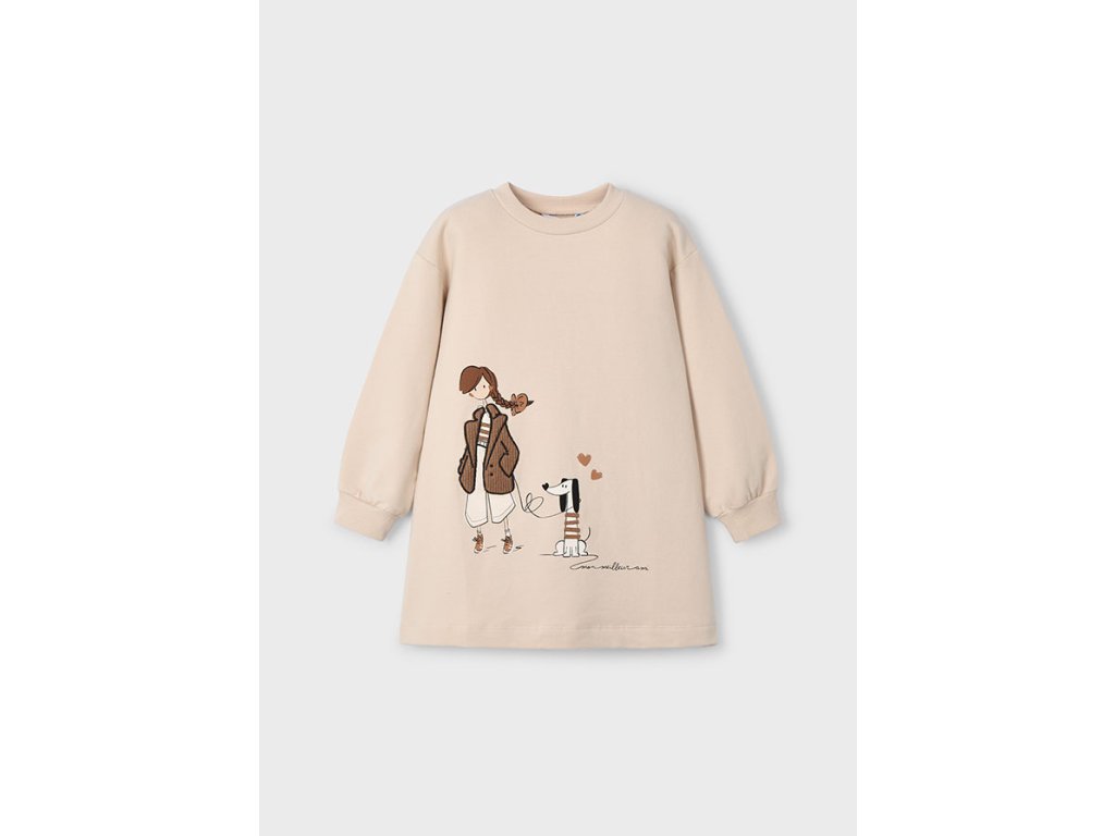 Roztomilé, pohodlné a stylové – přesně takové jsou tyto mikinové šaty s originálním potiskem holčičky a jejího pejska. Jemný béžový odstín a volnější střih zajišťují pohodlí po celý den – ideální volba do školky, školy i na víkendový výlet!