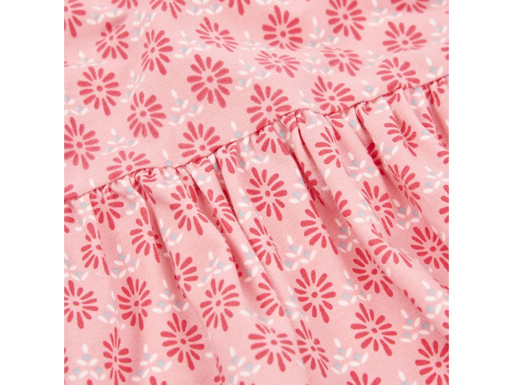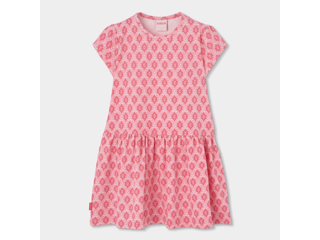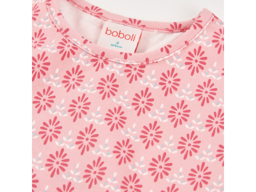 Roztomilé dívčí šaty Boboli v jemné růžové barvě s veselým květinovým vzorem jsou ideální volbou pro letní dny. Pohodlný střih s krátkým rukávem a nabíranou sukní dodává šatům hravý a dívčí vzhled.