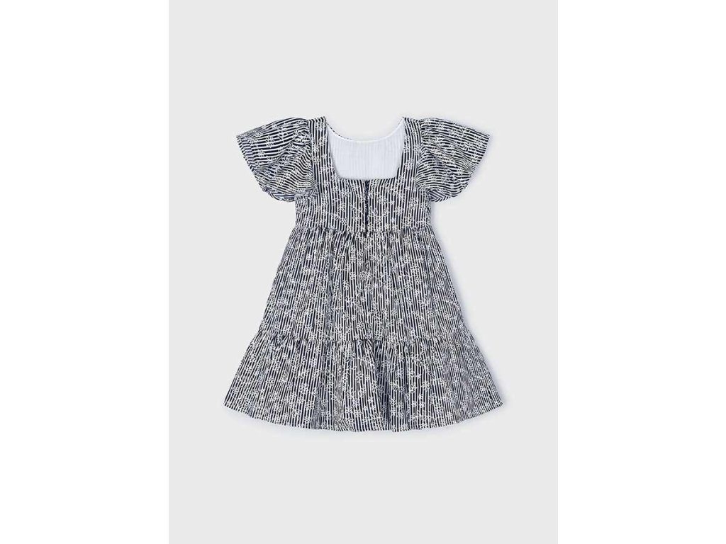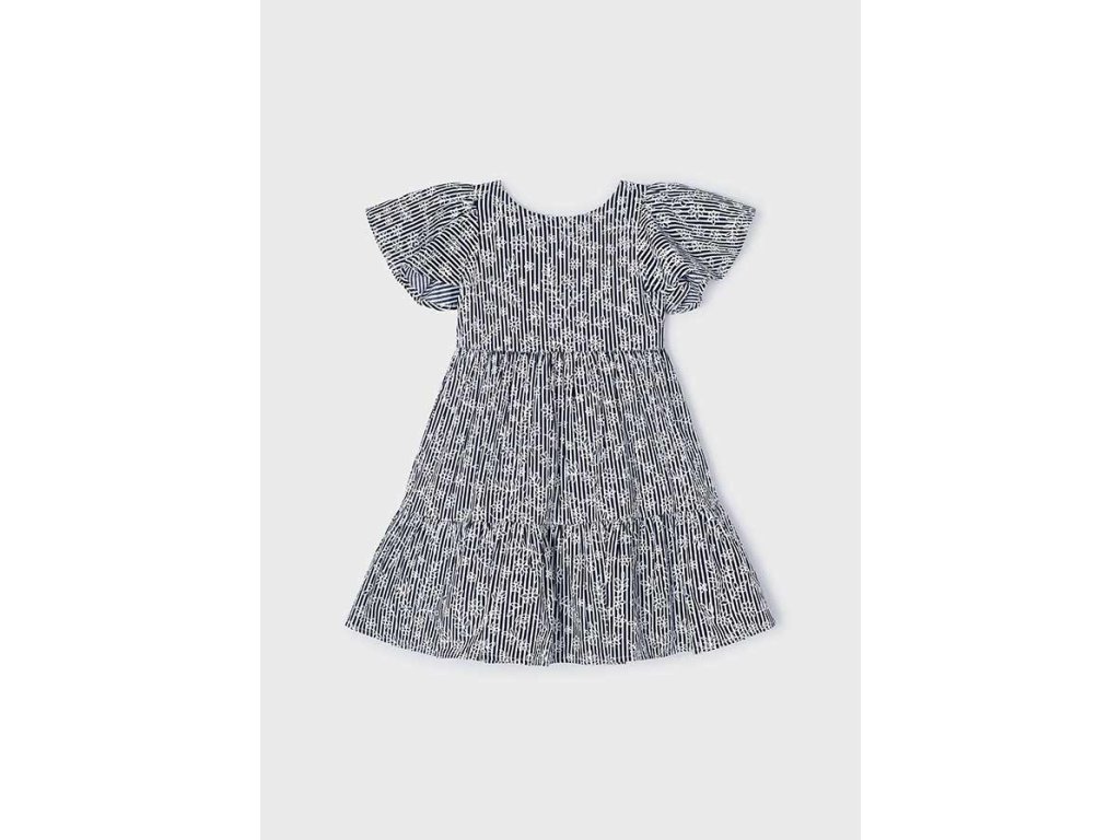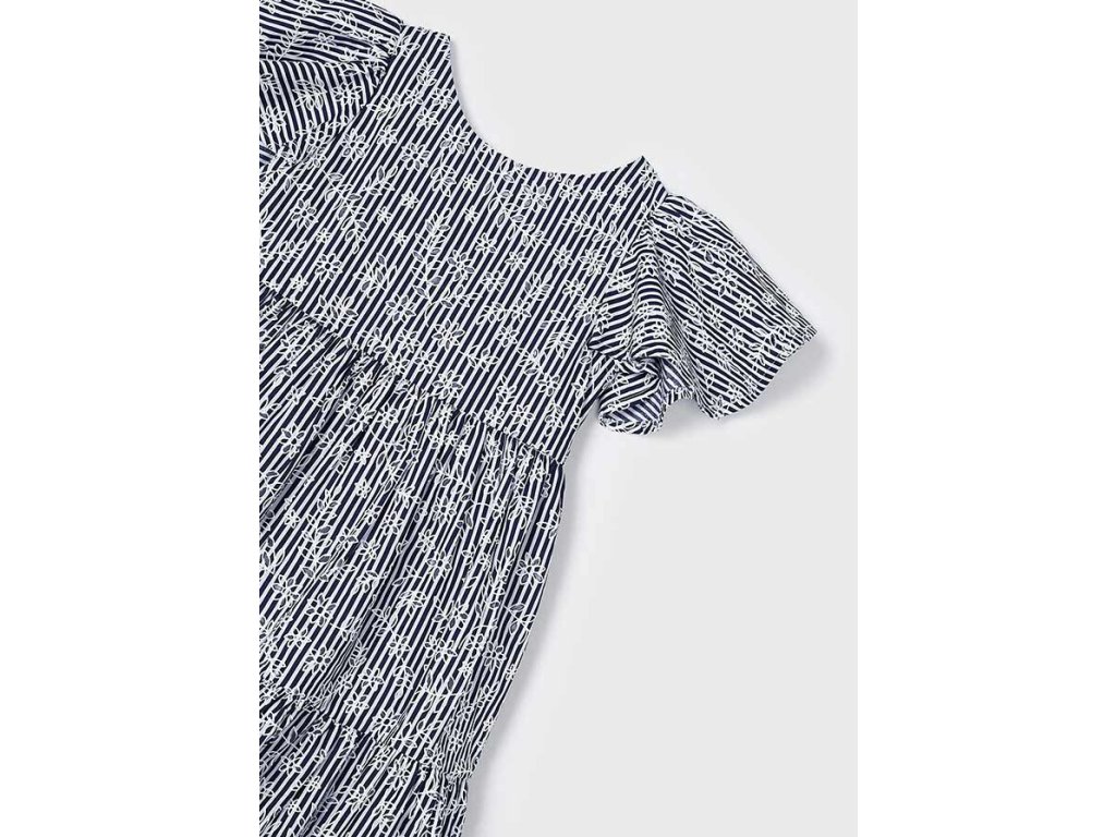 Tyto modré dívčí šaty Mayoral v barvě navy‑blue s bílými proužky a květinovým detailem dotvoří styl s elegancí i hravostí. Jsou navrženy s rozkošnými flutter rukávky, střihem do áčka a vrstvou baťuškové sukně – ideální jak na slavnostní chvíle, tak na víkendová dobrodružství.