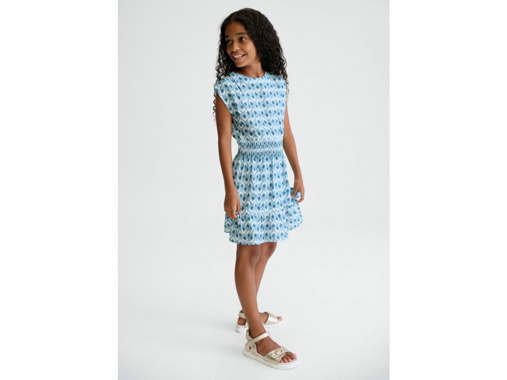 Stylové dívčí šaty Mayoral v jemném modrém odstínu s moderním geometrickým potiskem jsou ideální volbou pro letní dny. Lehký a příjemný materiál z viskózy s elastanem zajišťuje maximální pohodlí při nošení a dostatečnou pružnost pro pohyb i hru.