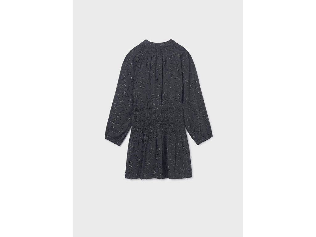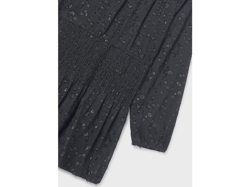 Elegantní dívčí šaty Mayoral v černé barvě s jemným třpytivým vzorem a dlouhými rukávy jsou ideální volbou pro slavnostní příležitosti. Žabičkování v pase krásně zvýrazní siluetu a zaručí pohodlné nošení. Díky lehkému materiálu s podšívkou se šaty příjemně nosí a zároveň působí luxusním dojmem. Perfektní volba na oslavy, svátky i rodinné události.