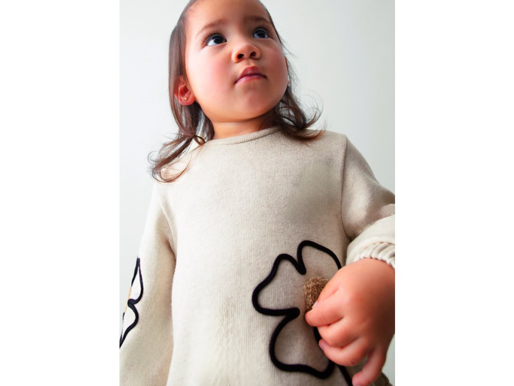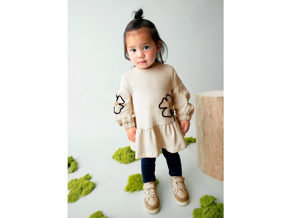 Rozkošné béžové dívčí šaty Mayoral s dlouhým rukávem a hravými květinovými aplikacemi na přední části i rukávech. Pohodlný volnější střih s nařaseným spodním lemem poskytuje dostatek volnosti pro pohyb. Praktické zapínání na knoflíčky na zádech usnadňuje oblékání. Ideální pro každodenní nošení i slavnostnější příležitosti.