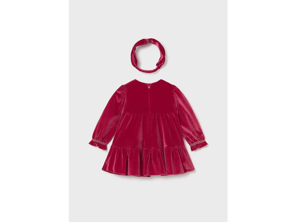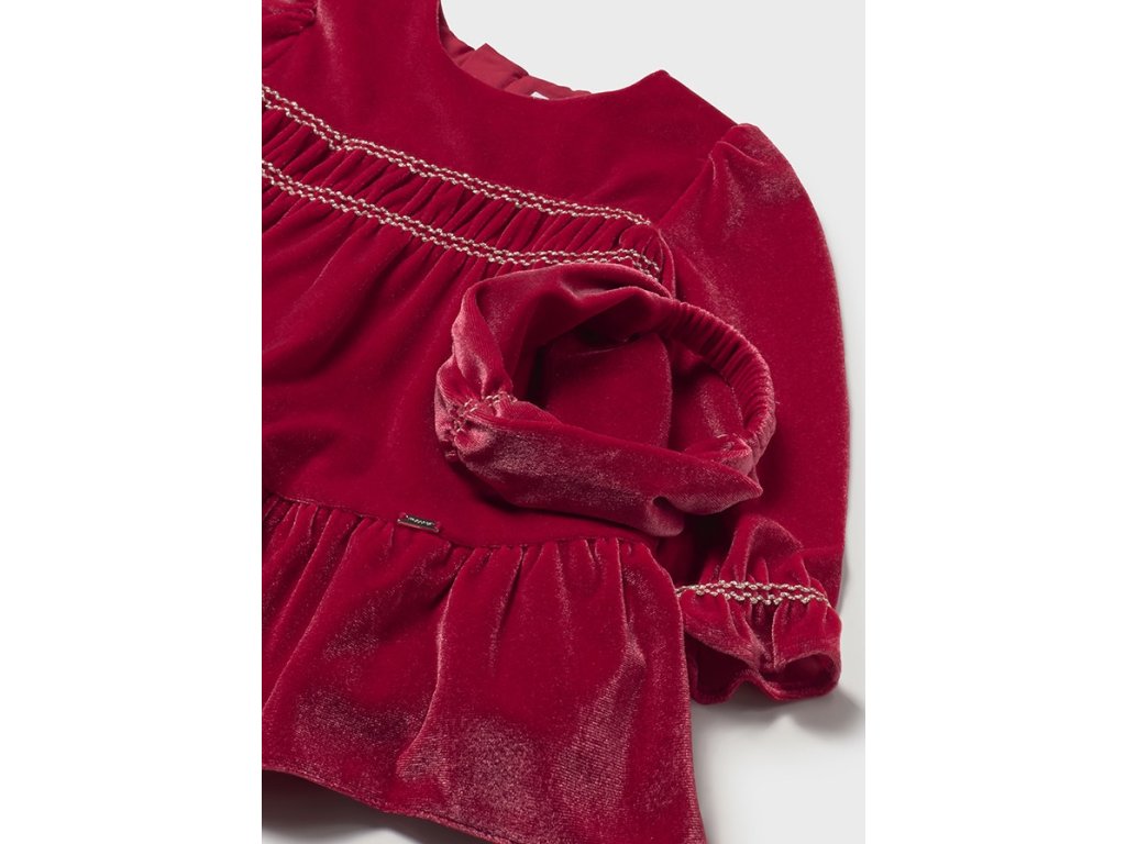 Elegantní sametové šaty Mayoral s čelenkou v nádherné červené barvě jsou ideální volbou pro slavnostní příležitosti i rodinné oslavy. Šaty mají dlouhý rukáv s jemným nařasením, zdobné detaily s lesklou nití a volánový spodní lem, který dodává šatům šmrnc. Součástí setu je ladící čelenka, která celý outfit krásně doplní.
