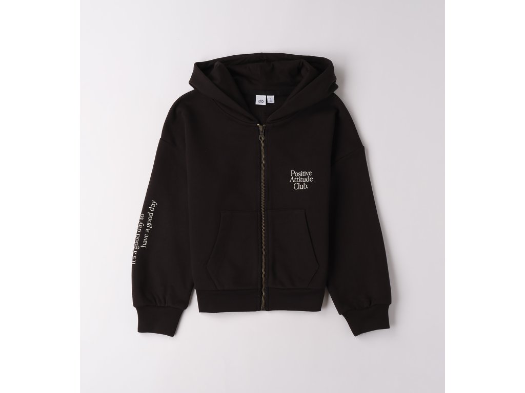 Stylová dívčí a chlapecká mikina s kapucí IDO v černé barvě. Přední zip, klokanní kapsa a potisk Positive Attitude Clubna hrudi dodávají moderní vzhled. Pohodlný střih s dlouhým rukávem a žebrovanými lemy zajistí komfort při každodenním nošení. Vyrobeno ze 100% bavlny – měkké, prodyšné a příjemné k pokožce. Skvělá volba do školy, na volný čas i sportovní aktivity.