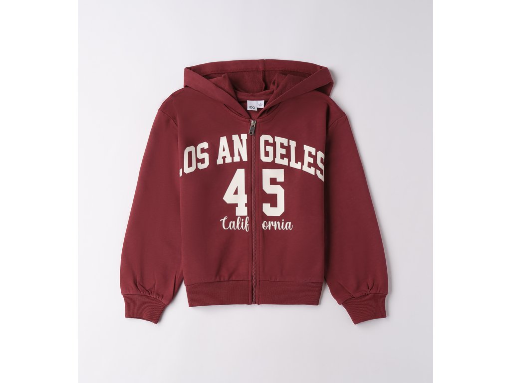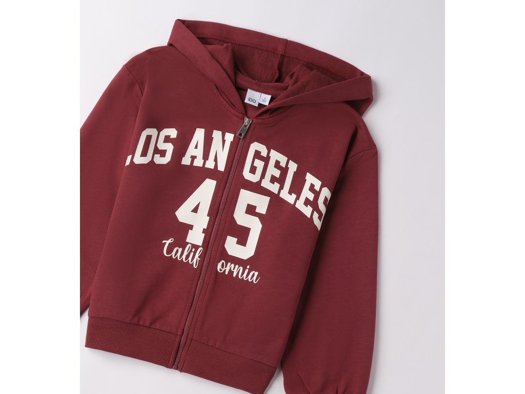 Stylová chlapecká mikina IDO ve vínové barvě s kapucí a praktickým zipem. Přední část zdobí výrazný potisk "LOS ANGELES 45 California", který dodává sportovní a trendy vzhled. Mikina je pohodlná, příjemná na nošení a ideální na každý den do školy, školky i volný čas.