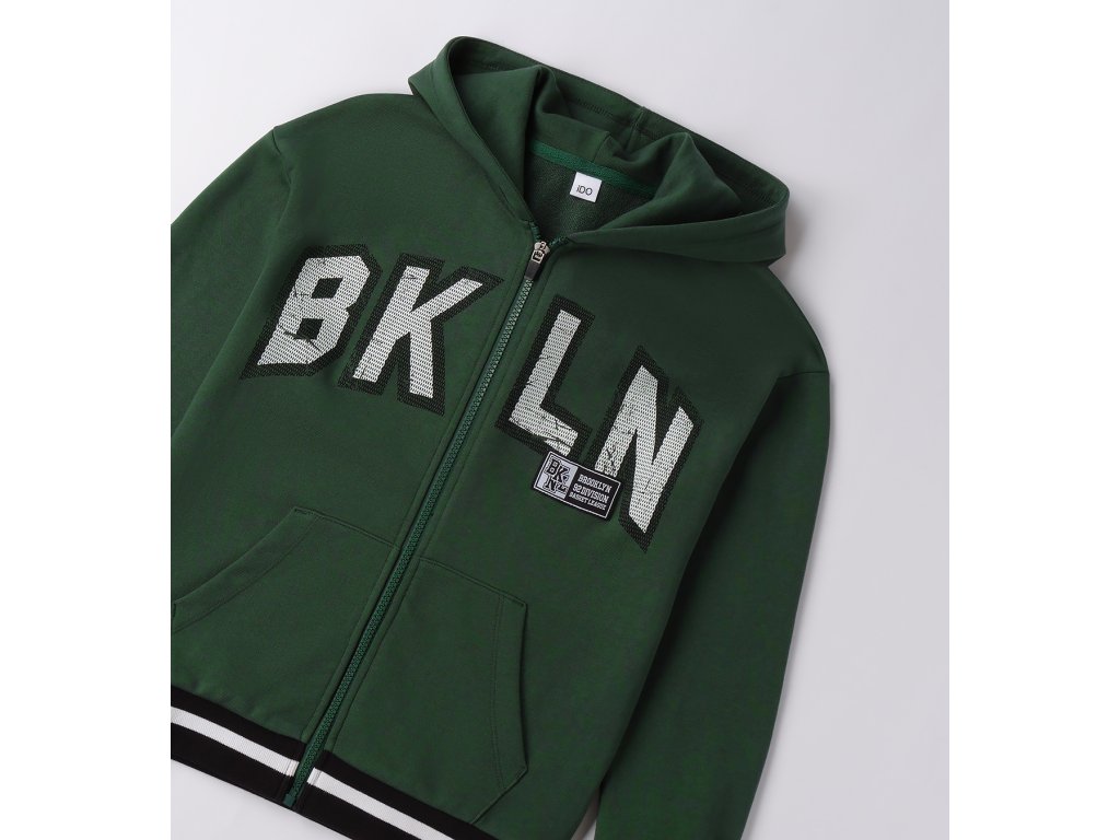 Stylová chlapecká mikina IDO v tmavě zelené barvě s nápisem BKLN na přední straně. Mikina má pohodlný zip po celé délce, praktickou kapuci a přední kapsy. Rukávy i spodní lem zdobí černobílé pruhy, které dodávají sportovní vzhled. Ideální na každodenní nošení do školy i na volný čas.