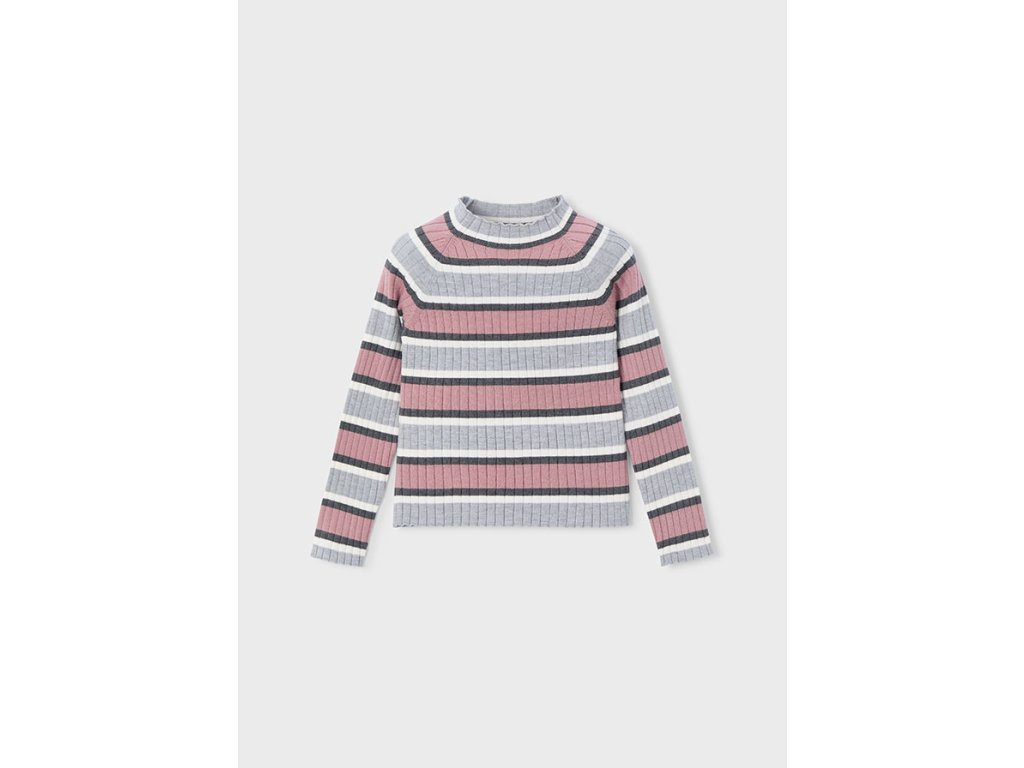 Stylový dívčí svetr Mayoral v pruhovaném designu v kombinaci růžové, šedé, bílé a černé barvy. Svetr má žebrovanou strukturu, stojáček a pružný materiál, který zajistí pohodlí po celý den. Skvěle se hodí k džínám i sukni – ideální pro školu i volný čas.