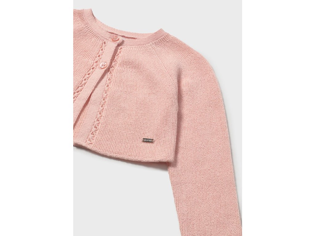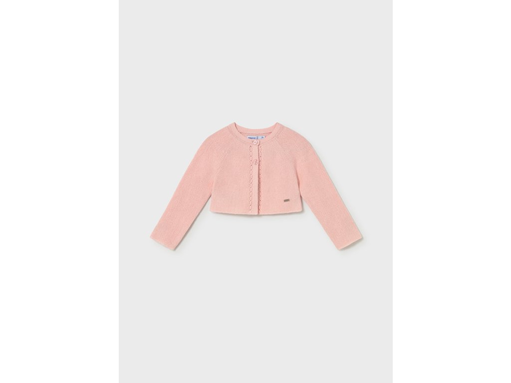 Jemné dívčí bolerko Mayoral v něžném růžovém odstínu je ideálním doplňkem ke slavnostním šatům i pro elegantní každodenní outfit. Krátký střih krásně sedí přes ramena a zahřeje v chladnějších dnech, aniž by zakryl krásu šatů. Bolerko zdobí decentní pletený vzor a zapínání na knoflíček, které podtrhuje jeho elegantní vzhled.