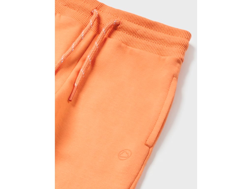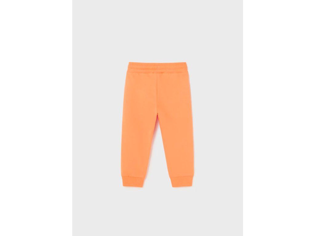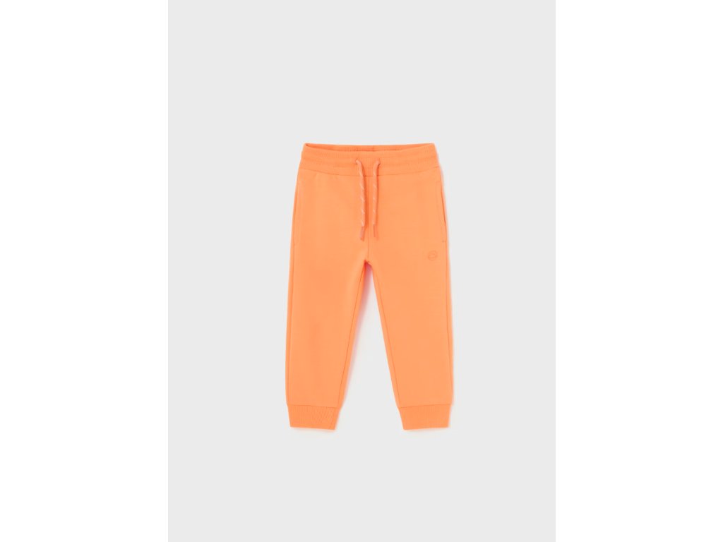 Oranžové tepláky Mayoral s pružným pasem a jsou ukončené nápletem.