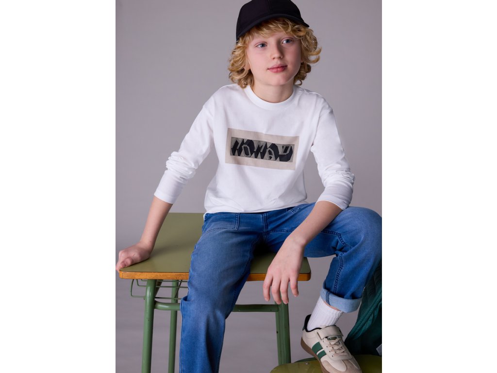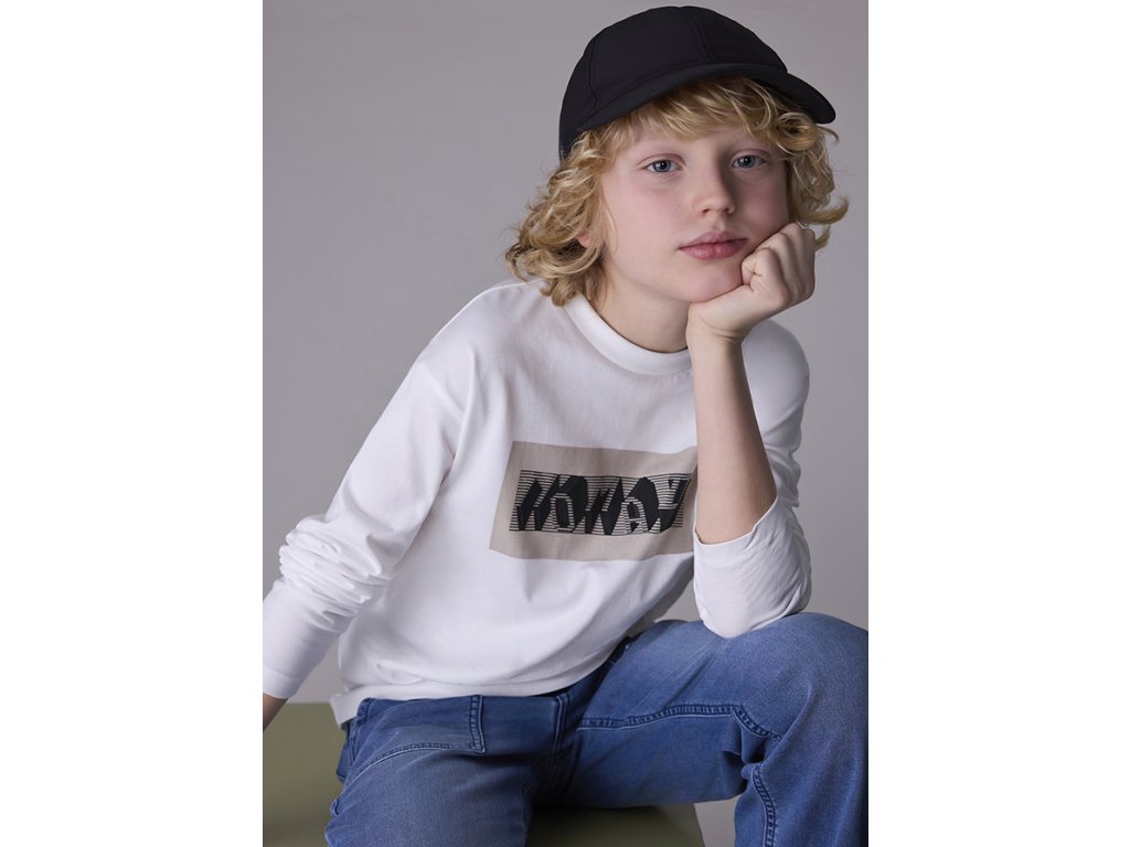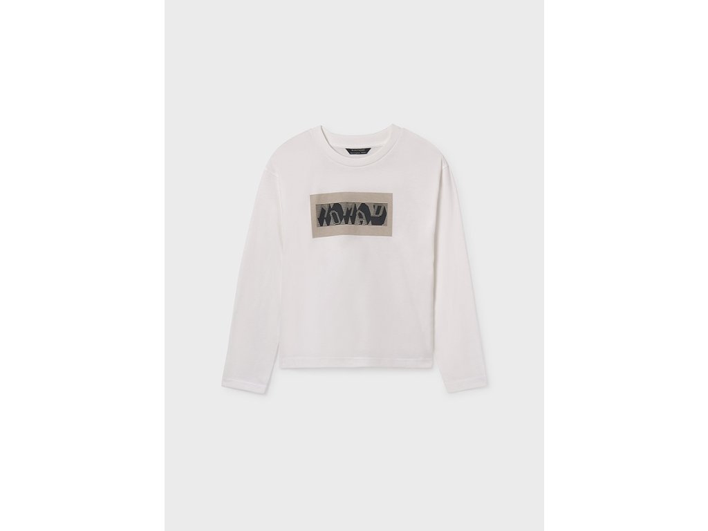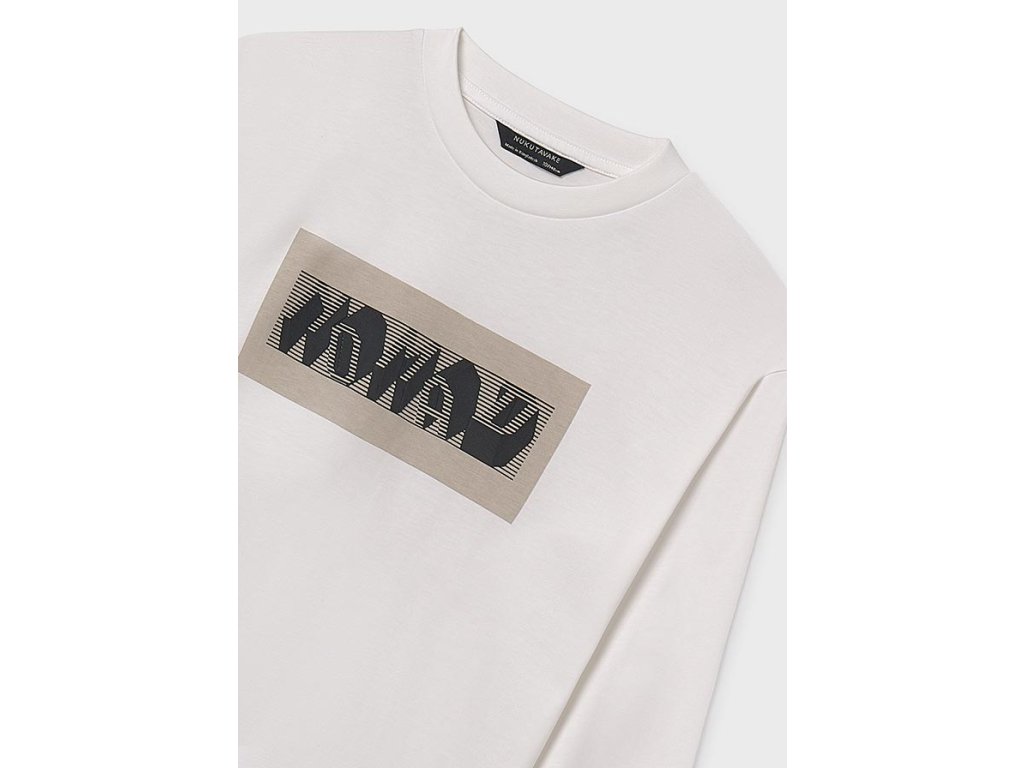Stylové chlapecké tričko s dlouhým rukávem Nukutavake by Mayoral v bílé barvě s originálním potiskem vpředu. Pohodlný střih a měkký materiál zajistí celodenní komfort jak do školy, tak na volný čas. Díky modernímu designu se snadno kombinuje s džínami nebo sportovními kalhotami.