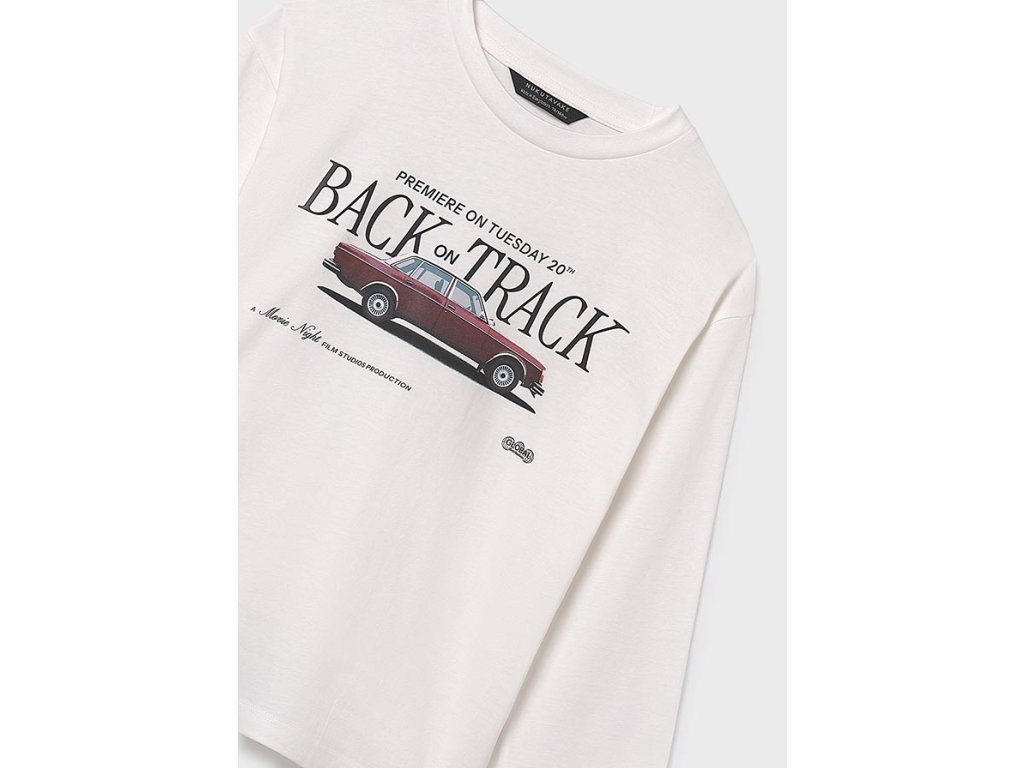 Stylové chlapecké tričko s dlouhým rukávem Nukutavake z kolekce Mayoral. Bílý model s originálním potiskem auta a nápisem Back on Track zaujme všechny malé milovníky aut. Vyrobeno ze 100% bavlny pro maximální pohodlí a prodyšnost. Ideální k džínům i mikině pro každodenní nošení do školy i volný čas.