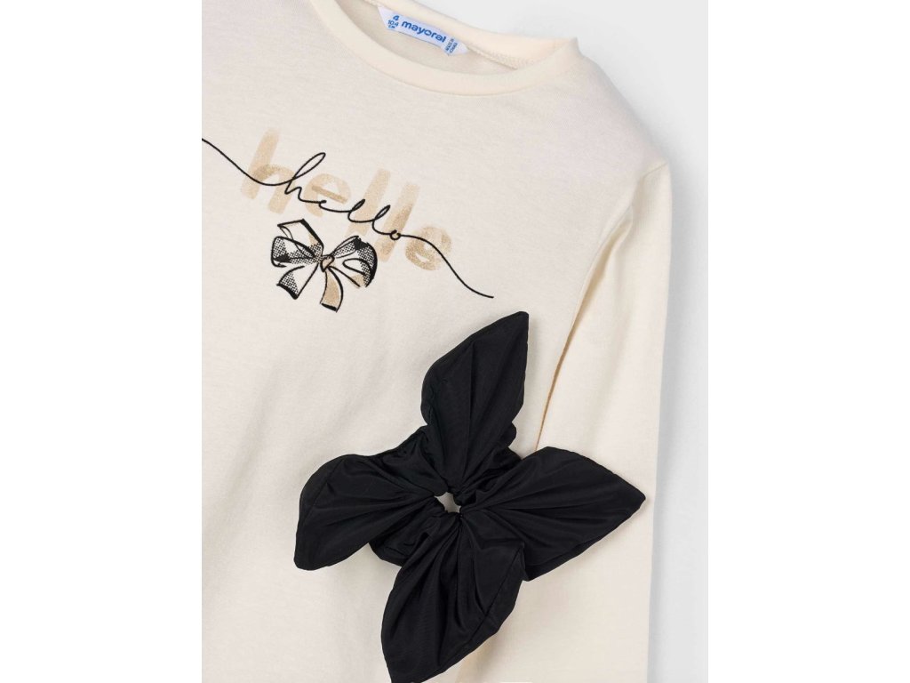 Elegantní dívčí tričko s dlouhým rukávem od značky Mayoral v bílé barvě, zdobené nápisem hello a potiskem mašle. Součástí setu je také stylová černá gumička do vlasů s velkou mašlí, která krásně ladí s tričkem a doplní každý outfit. Tričko je vyrobené ze 100% bavlny, takže je příjemné na nošení a šetrné k dětské pokožce. Ideální volba pro každodenní nošení i speciální příležitosti.