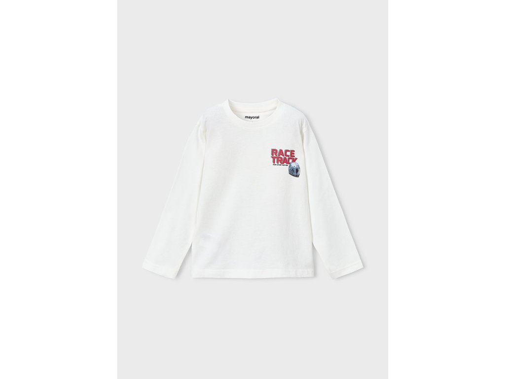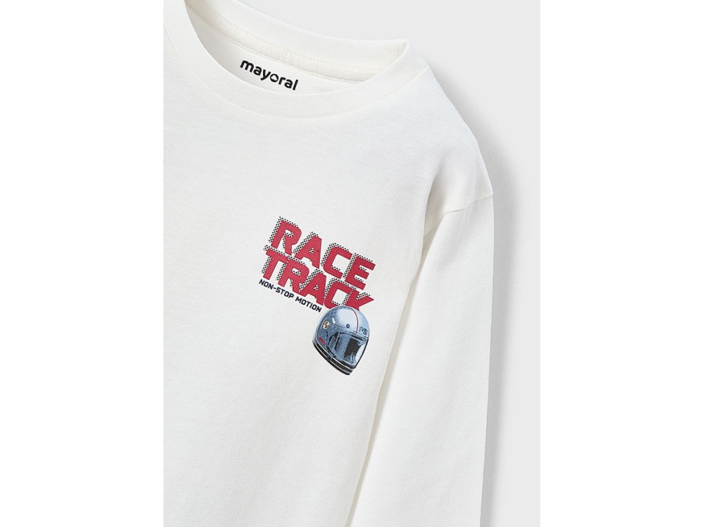 Stylové chlapecké tričko Mayoral s dlouhým rukávem v bílé barvě je ideální pro všechny malé fanoušky rychlých aut. ✔ Přední i zadní část zdobí závodní motiv s helmou a nápisem Race Track, který dodává tričku sportovní vzhled. Vyrobeno ze 100% příjemné bavlny, která zajistí maximální pohodlí při každodenním nošení do školy, školky i na volný čas.