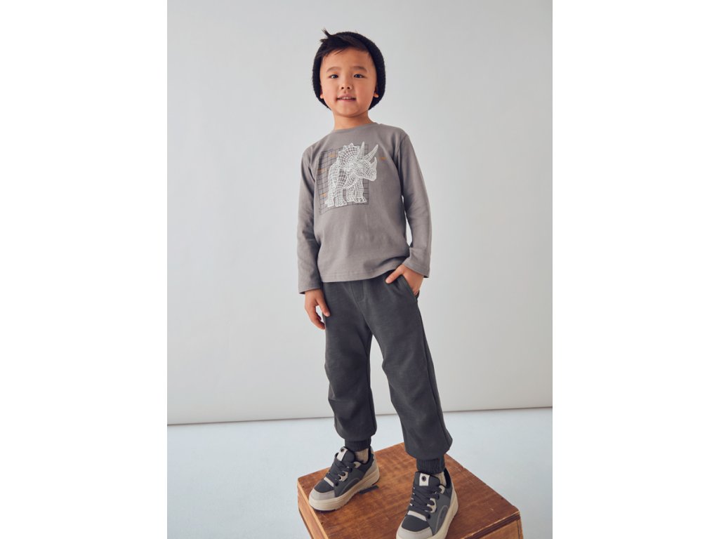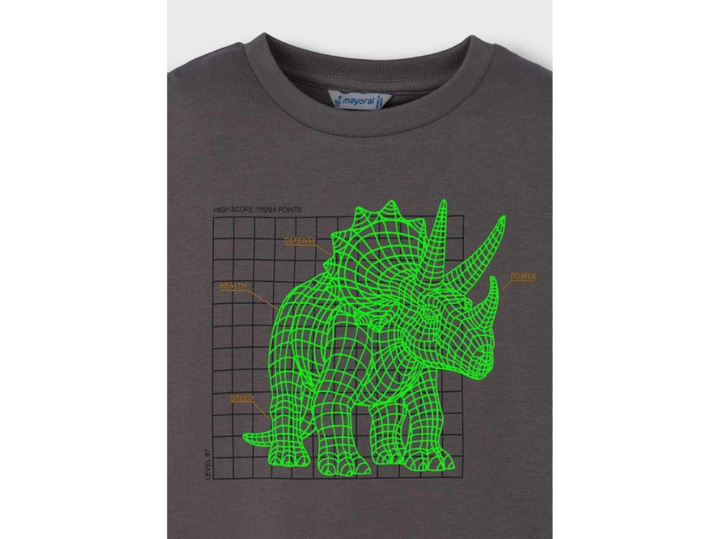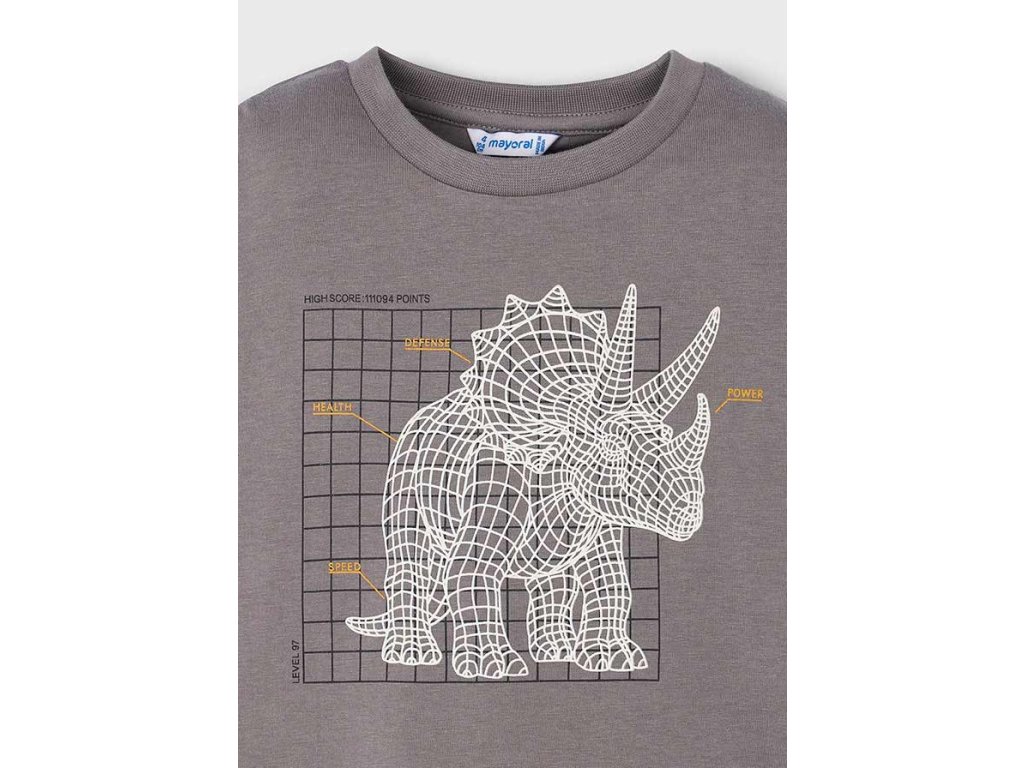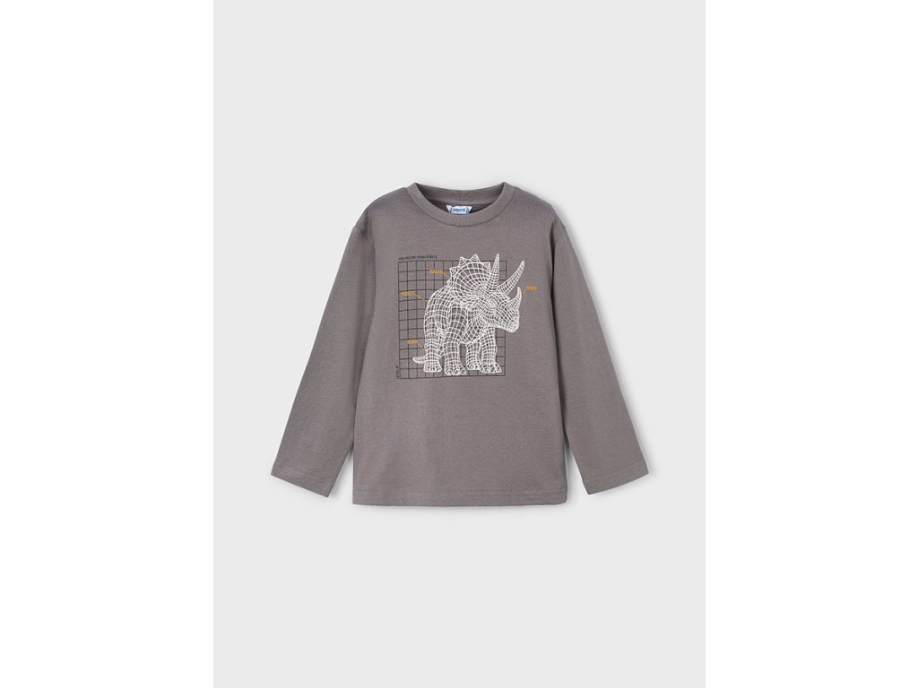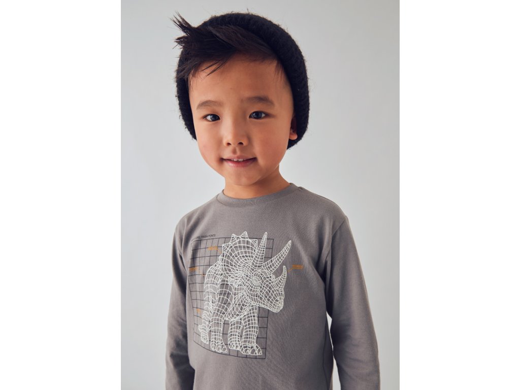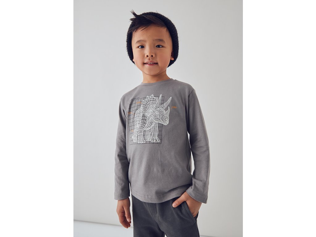 Stylové chlapecké tričko Mayoral s dlouhým rukávem v šedé barvě. Na přední straně zaujme originální 3D potisk dinosaura Triceratopse s grafickými detaily, který ve tmě svítí. Tričko je vyrobeno ze 100% bavlny, takže je příjemné na dotek, prodyšné a ideální na celodenní nošení. Skvělý kousek pro malé milovníky dinosaurů, vhodný do školy, školky i na volný čas.