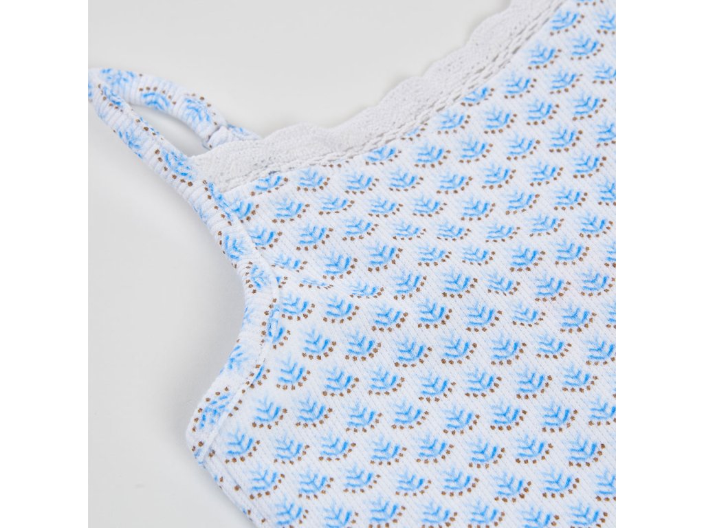 Lehké a pohodlné dívčí tílko Boboli na ramínka je ideální volbou pro teplé letní dny. Jemný vzor v modro-bílém provedení působí svěže a hravě, zatímco decentní krajka v horní části dodává tílku něžný dívčí vzhled.